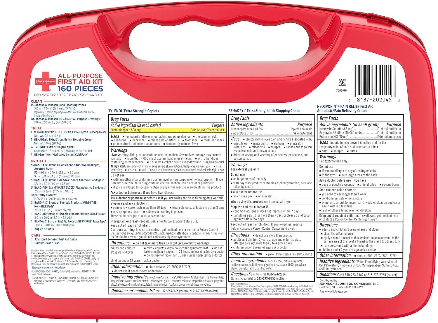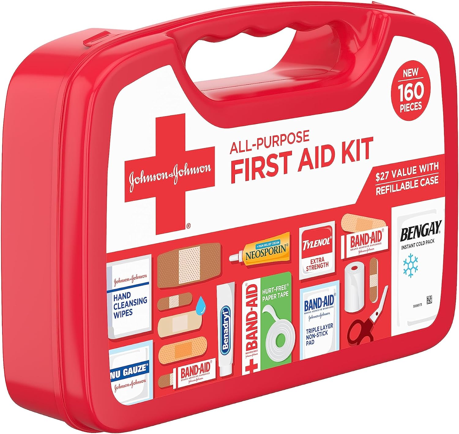 - 160-piece Johnson & Johnson All-Purpose Portable Emergency First Aid Kit is ideal for home, in cars, outdoors, dorm rooms, & while camping, cooking or on-the-go to help care for minor cuts, scrapes, burns, itches, pain, skin rashes & insect bites