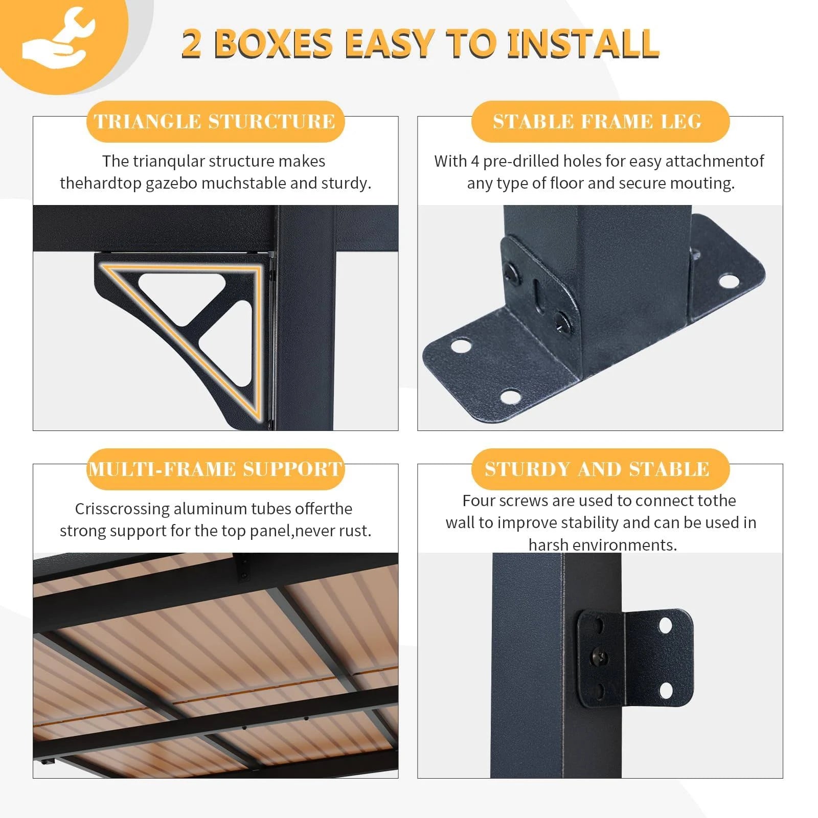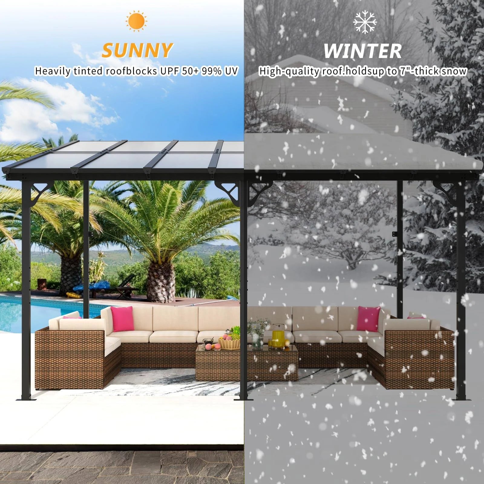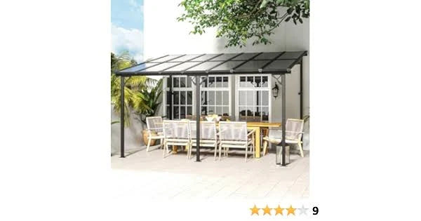 Brand: JolydaleColor: BlackFeatures: 銆怗reat Load-Bearing銆慣he pergola can withstand bad conditions such as heavy snow or rain as it is designed with an excellent load bearing of 55lbs/m2. The wind resistance level is 31-38mph and the snow carrying depth is 4 inch respectively once you fasten it securely and tightly on the wall and ground. 銆怴isual Appeal銆慏ue to the unique design and modern aesthetics, this gazebo with sloped roof has a visually appealing presence. The angled roof and other distinctive design elements make it a focal point in outdoor spaces, adding aesthetic value to any garden, yard, or outdoor area. 銆怘igh Quality Material銆慡election of premium polycarbonate hollow sheet, our outdoor gazebo can provide excellent sunshade and block direct sunlight, offering a cool and comfortable space for occupants. It is so durable that can withstand long time use and has a long lifespan. 銆怳sage Guidance銆慤sers are recommended to mount the awning against a wall using the nails to ensure the maximum stability. The gazebo is perfect and suitable for use near a hot tub, pool, or as an relaxation space. All the parts and hardware you need are clearly numbered.