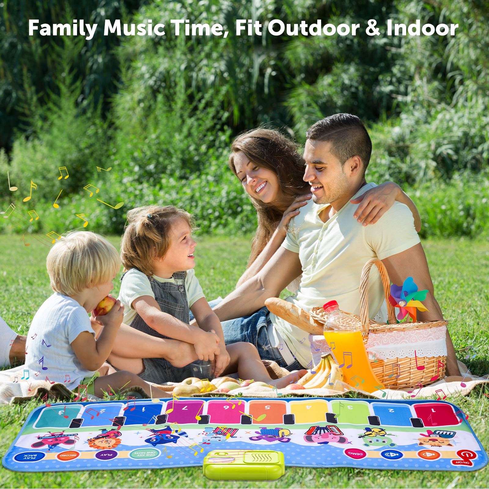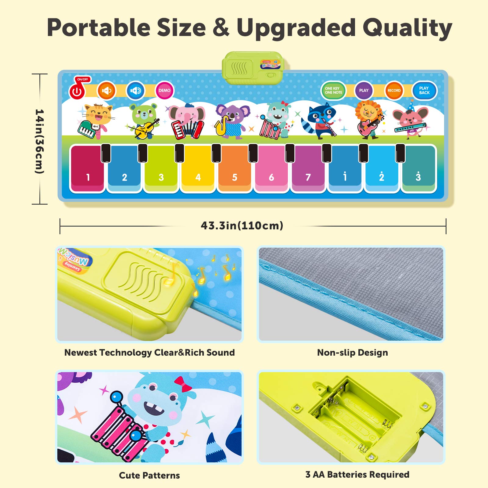 - u3010Portable Music Matu3011This piano kids' toy size is 43.3'' x14.2'', foldable and easy to carry, and saves space. You can enjoy electronic musical mats with your child outdoors or indoors. It's the best choice for your family trip.
