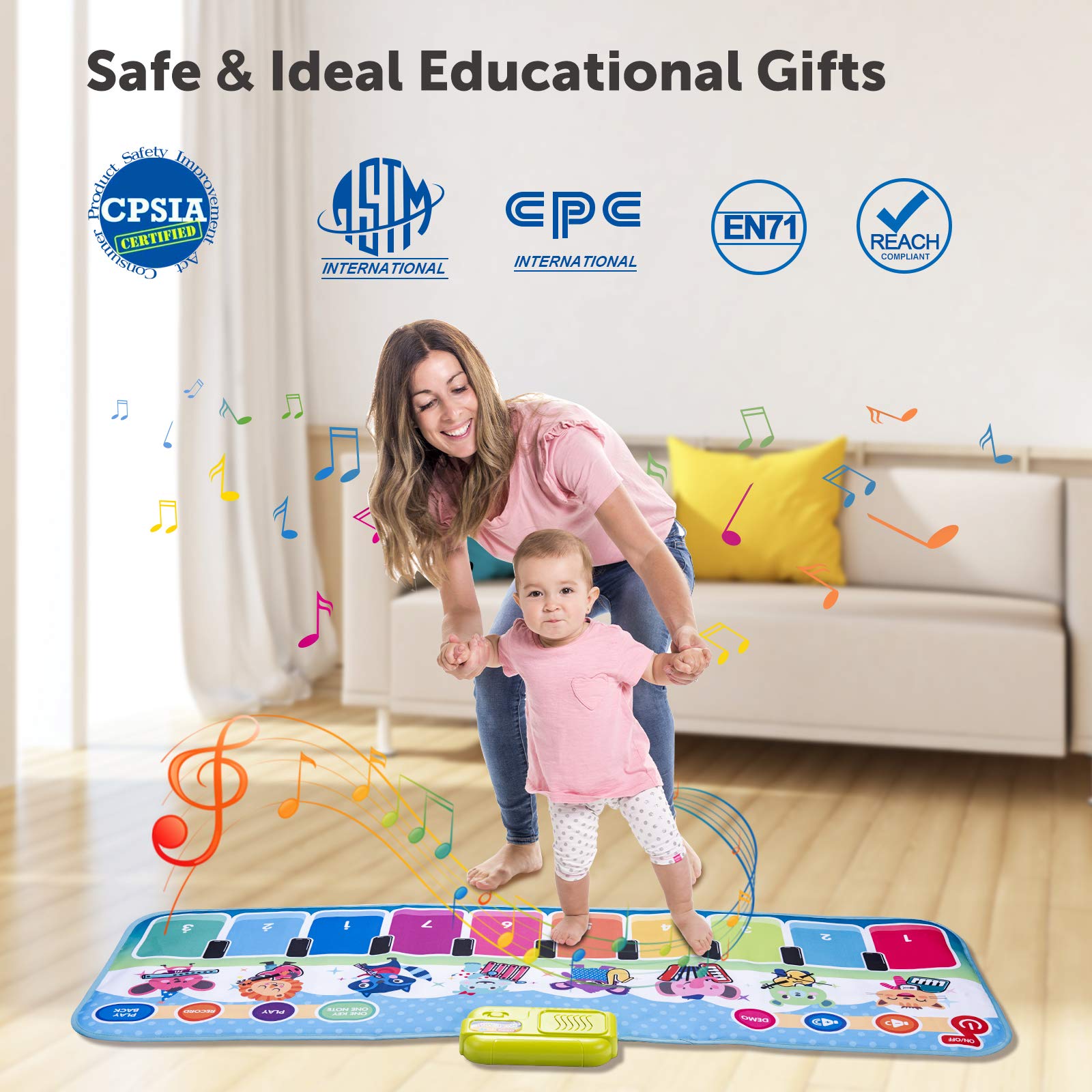 - u3010Multifunctional Floor Pianou3011Musical mat with 8 kinds of instrument sounds and 10 keys with corresponding musical tones are available for toddlers to learn to play music in many different styles. There are also 20 demos for imitating and learning using the record and playback Function. Educational floor piano can record your child's lovely creations and share them with all family and friends.