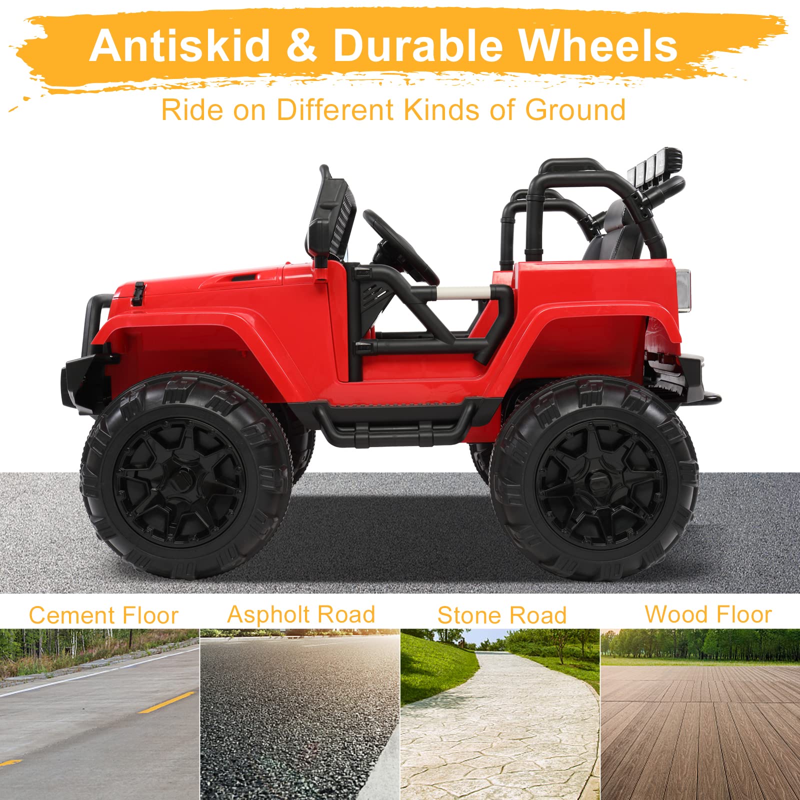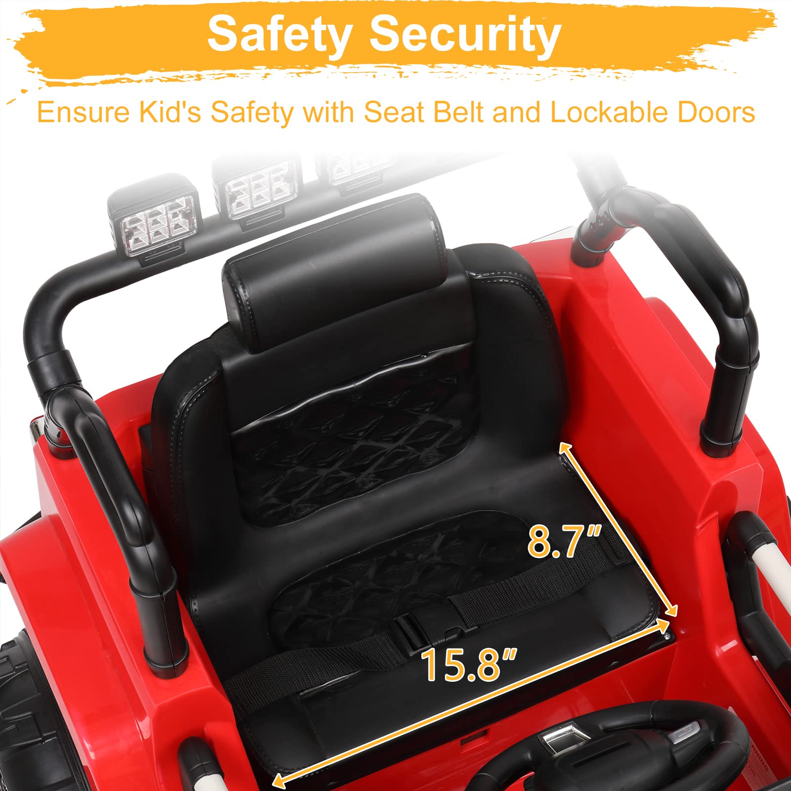 - Upgrade Wider Soft Seat:Equipped with upgrade wider soft seat with 15.8 Inches width with adjustable safety belts. Rubber traction strips on all tires. 4 power wheels with spring suspension system can greatly reduce the shock. Let the child can be fully immersed in the joy of driving