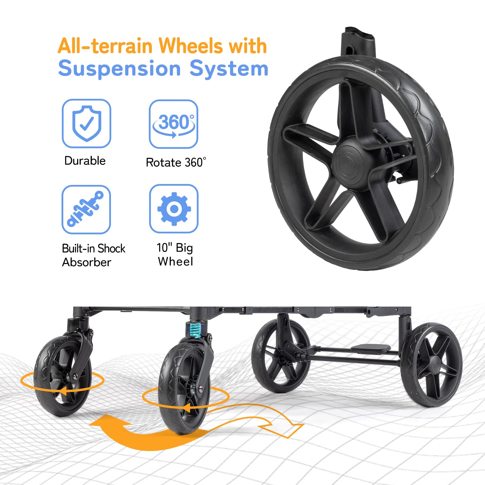 - Easy to Maneuver: Equipped with rugged all-terrain stroller, built to handle any adventure. With large wheels and sturdy construction, it can handle any terrain with ease. Whether you're heading to the park or hitting the trails, this 4 passengers stroller will keep your little one safe and comfortable