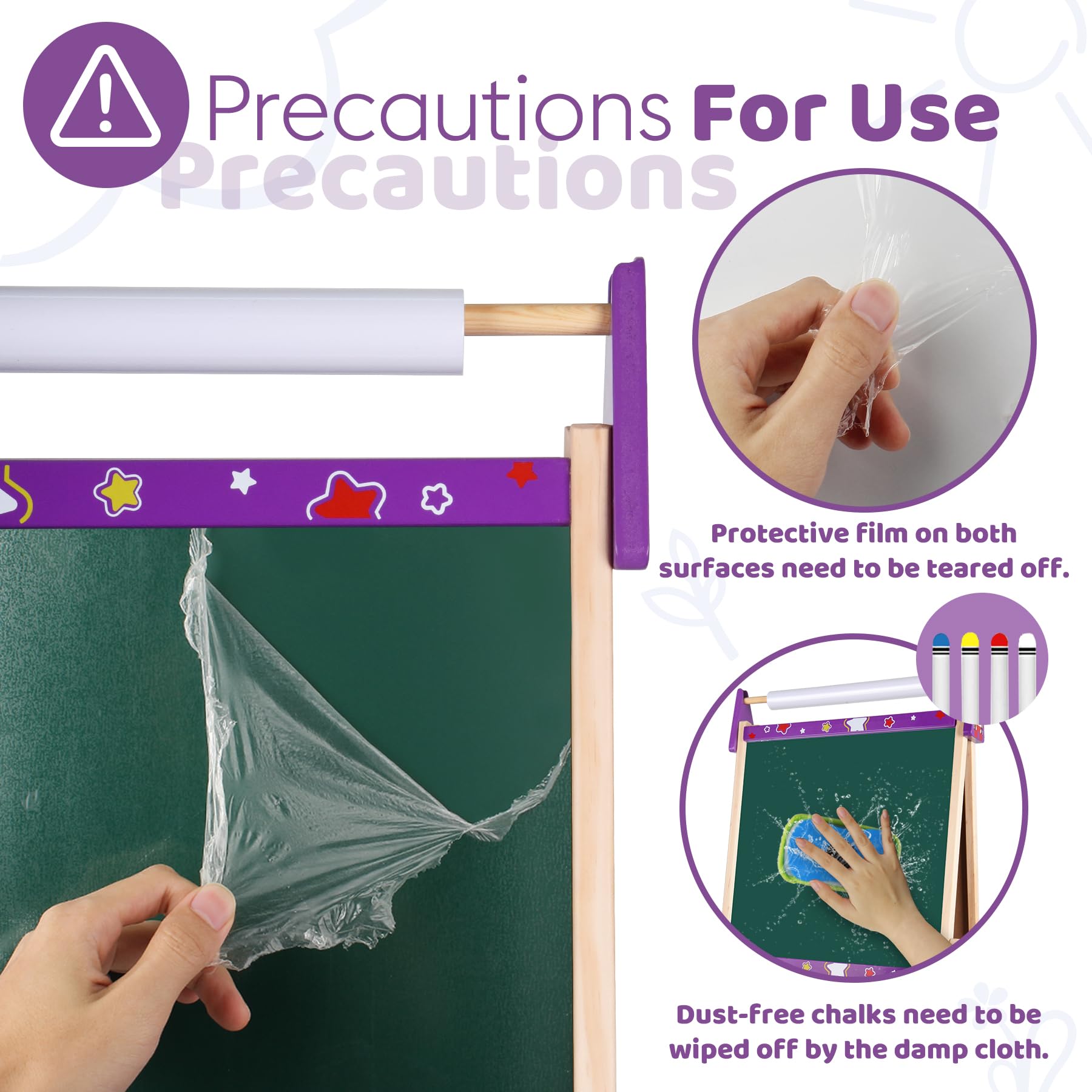 - u3010Unlimited Creation Waysu3011Infinite creative methods further stimulate children's creativity. This magnetic easel features a double-sided magnetic whiteboard and blackboard, providing a multifunctional surface for creative expression and learning. We have provided two rolls of paper to provide more creative choices, allowing children to use chalk and markers. A built-in tray can hold all their art supplies, making them within reach during the painting process.
