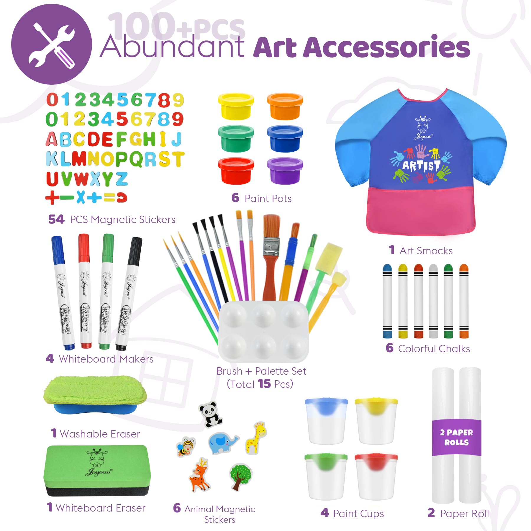 - u3010AlL IN ONE KID EASEL ACCESSORIESu3011Our easel for kids offers a complete experience of over 98 accessories. Including 2 paper rolls, 6 paint cans, 14 brushes and 1 set of color palettes, 1 art apron, 1 box of chalk, 4 whiteboard pens, 1 whiteboard eraser, 1 washable eraser, 4 painting cups, a set of colored magnetic letters and mathematics, meeting the needs of painting and learning. The complete accessories make the easel very suitable for indoor and outdoor painting.