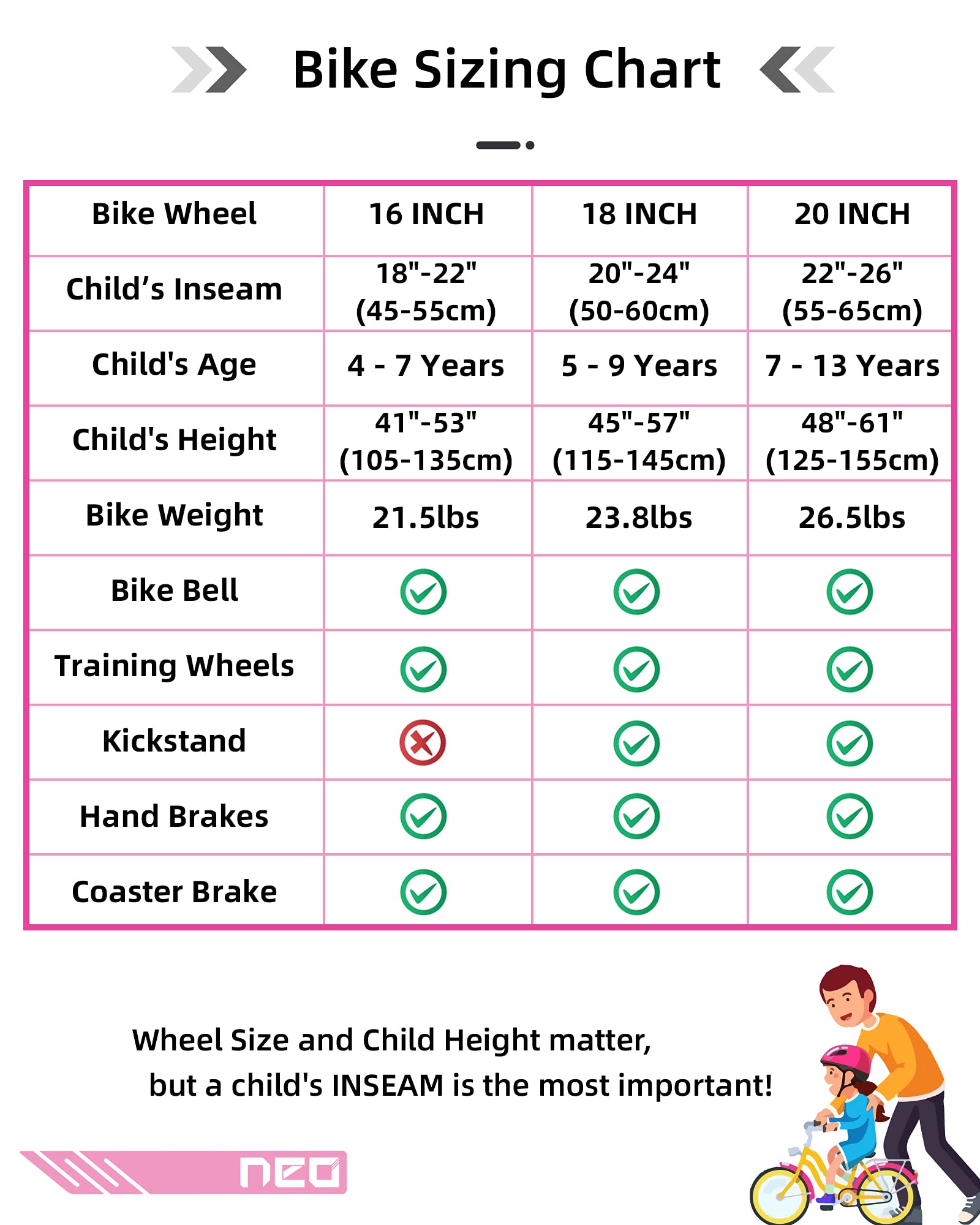 - Grow with Kids: The NEO Kid's Mountain Bike is great for first-time riders. Comes with detachable training wheels, a height-adjustable saddle, this kids bicycle can meet the needs of your child at different stages and grow with them.u00a0As your kids grow in confidence they can move to the next challenge.
