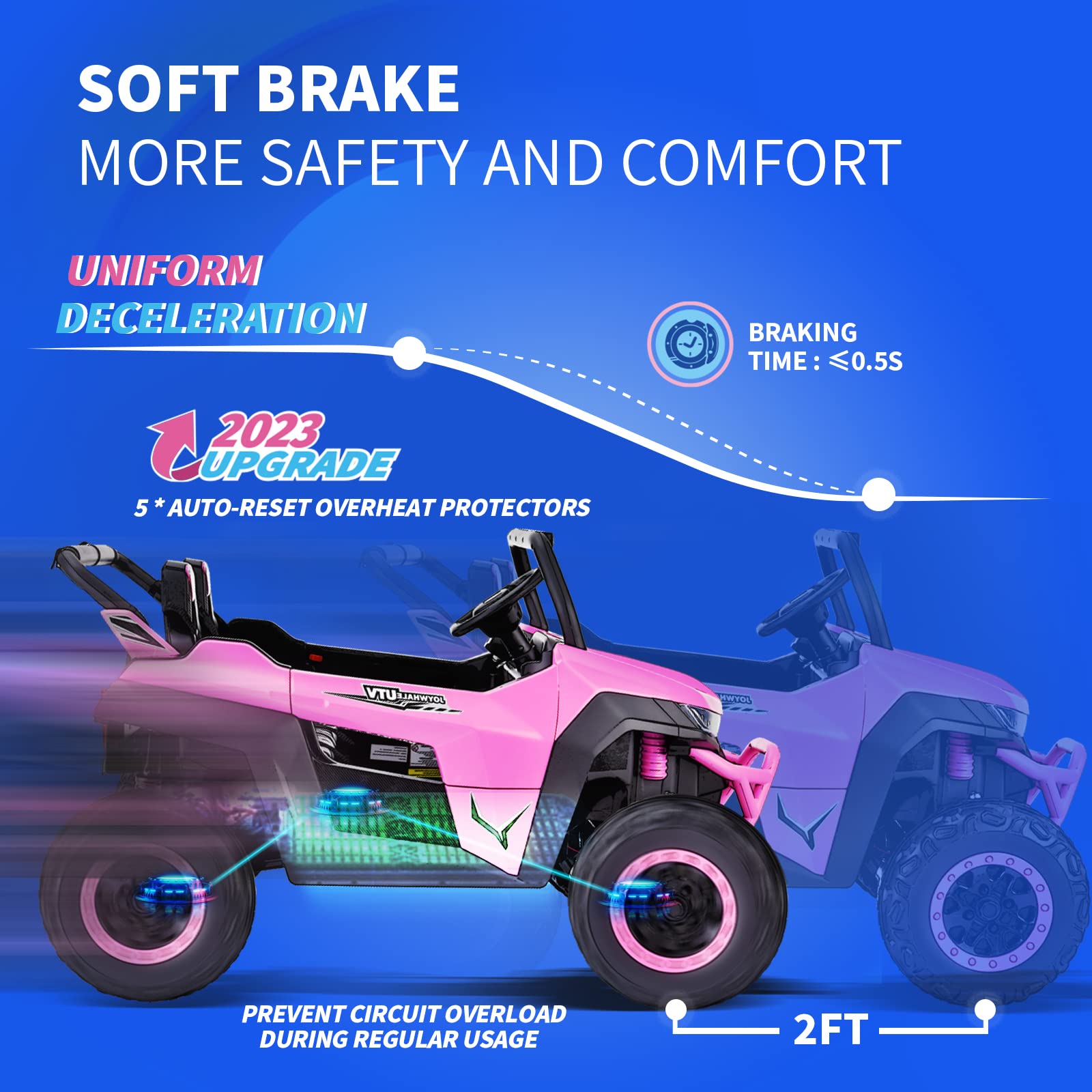 - ud83dude97u3010Excellent Safety Performanceu3011In the 2023 new model, we have added 5* Auto-reset Overheat Protectors to prevent overloading of the four drive motors and total circuits during normal use. The wear-resistant wheels equipped with full metal suspensions, effectively reducing the impact of bumps on rough roads, Additionally, each seat is fitted with a three-point seat belt, while the openable doors on both sides are equipped with safety locks, providing comprehensive protection for kids' safety.
