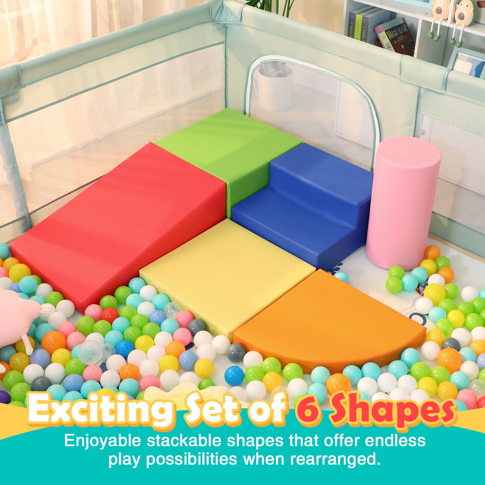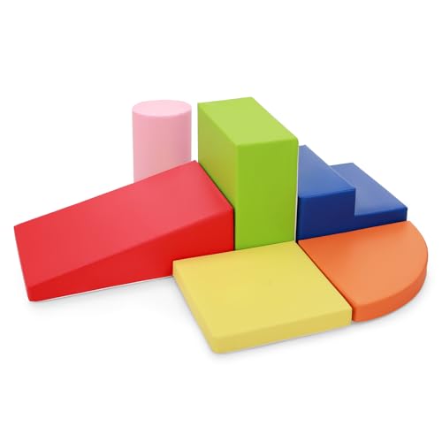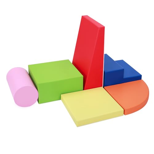 - 6 PIECE SET: A cylinder, a small rectangle, a large rectangle, a big triangle, a small triangle, and a blue stairs make up our foam play gym set. Six vibrant colors stimulates toddlers' visual development and allows them to stack and combine freely, allowing their imagination to run wild.