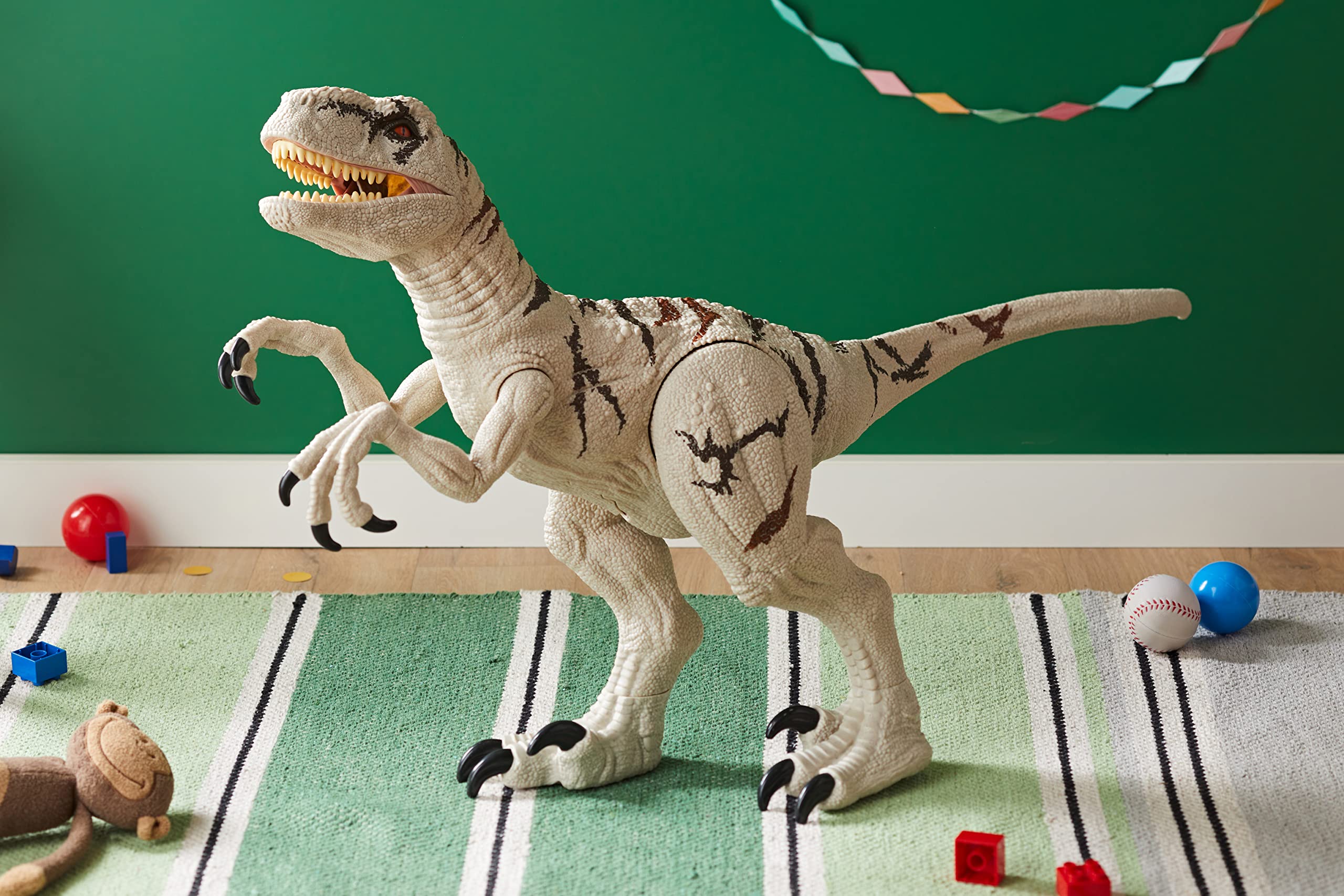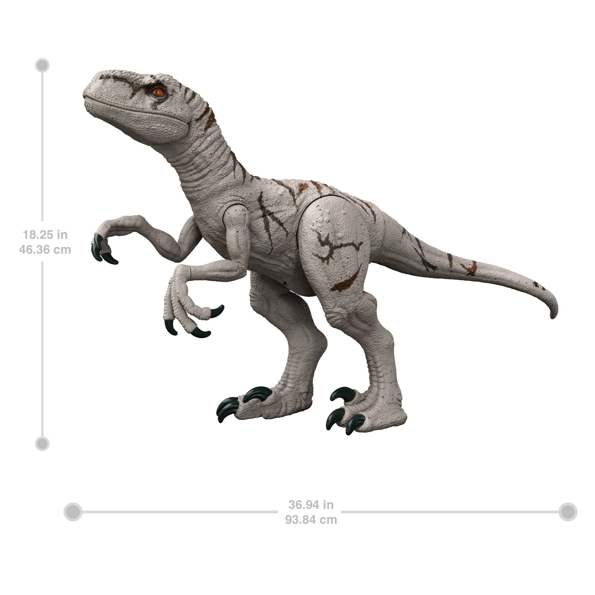 - Tell tall tales. This gigantic dinosaur figure is more than 3 FEET LONG and features authentic sculpting, texture and colors. The Atrociraptor stars in key battle scenes in Jurassic World Dominion.