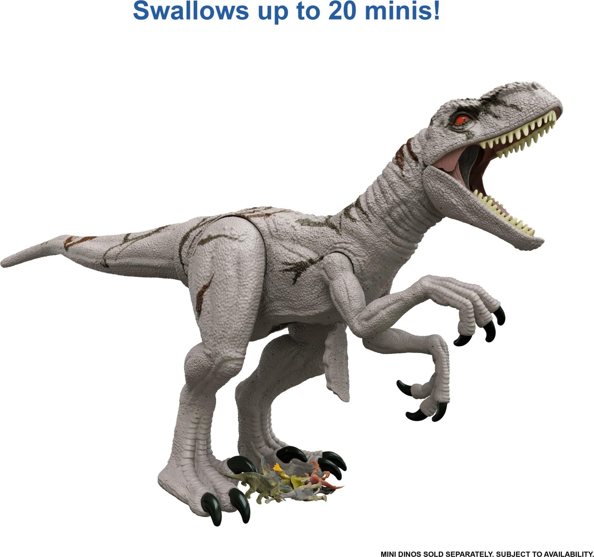 - Kids can take out all their animal instincts with this Atrociraptor that comes in a mighty size and is able to gobble up 20 mini figures whole. (Minis sold separately, subject to availability)