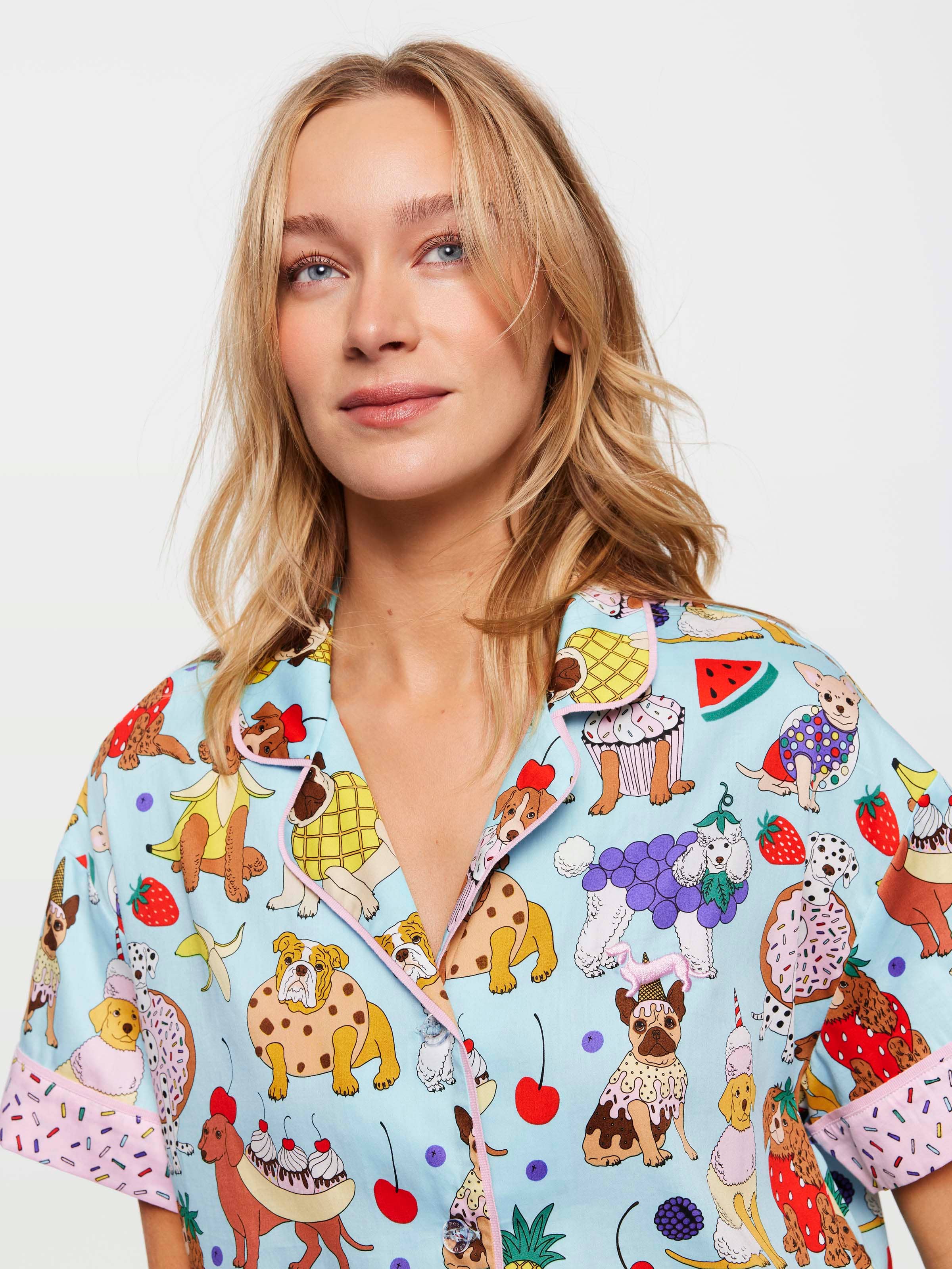 PJs you're sure to be drooling over, this women's short-sleeved set features an all-over print of your two favourite things: pups and snacks! Packaged in a matching fabric bag, this Karen Mabon pyjama set is definitely more than just a sprinkle of fun.?