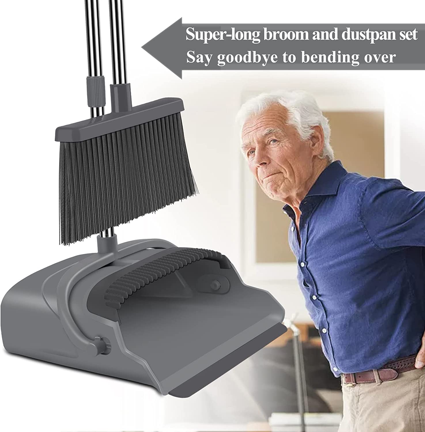 - [Self-Cleaning Dustpan Teeth] - Built in scraper and comb/Teeth for easy to Clean Broom into Dustpan , Clean Pet Hair and Human Hair with one Pull on the Teeth. The rubber lip of the dust pan is flush with the floor and the teeth clean out the bristles easily.