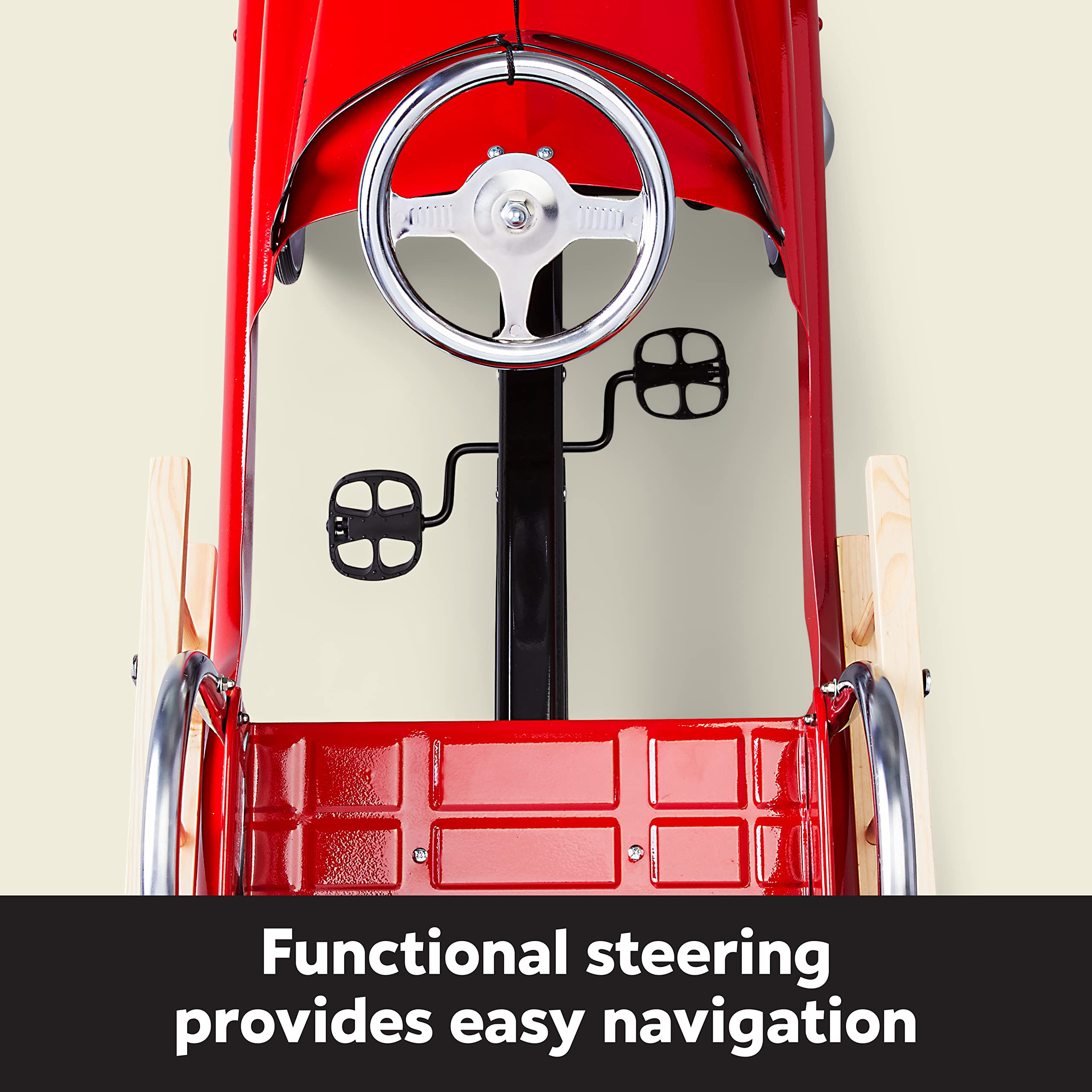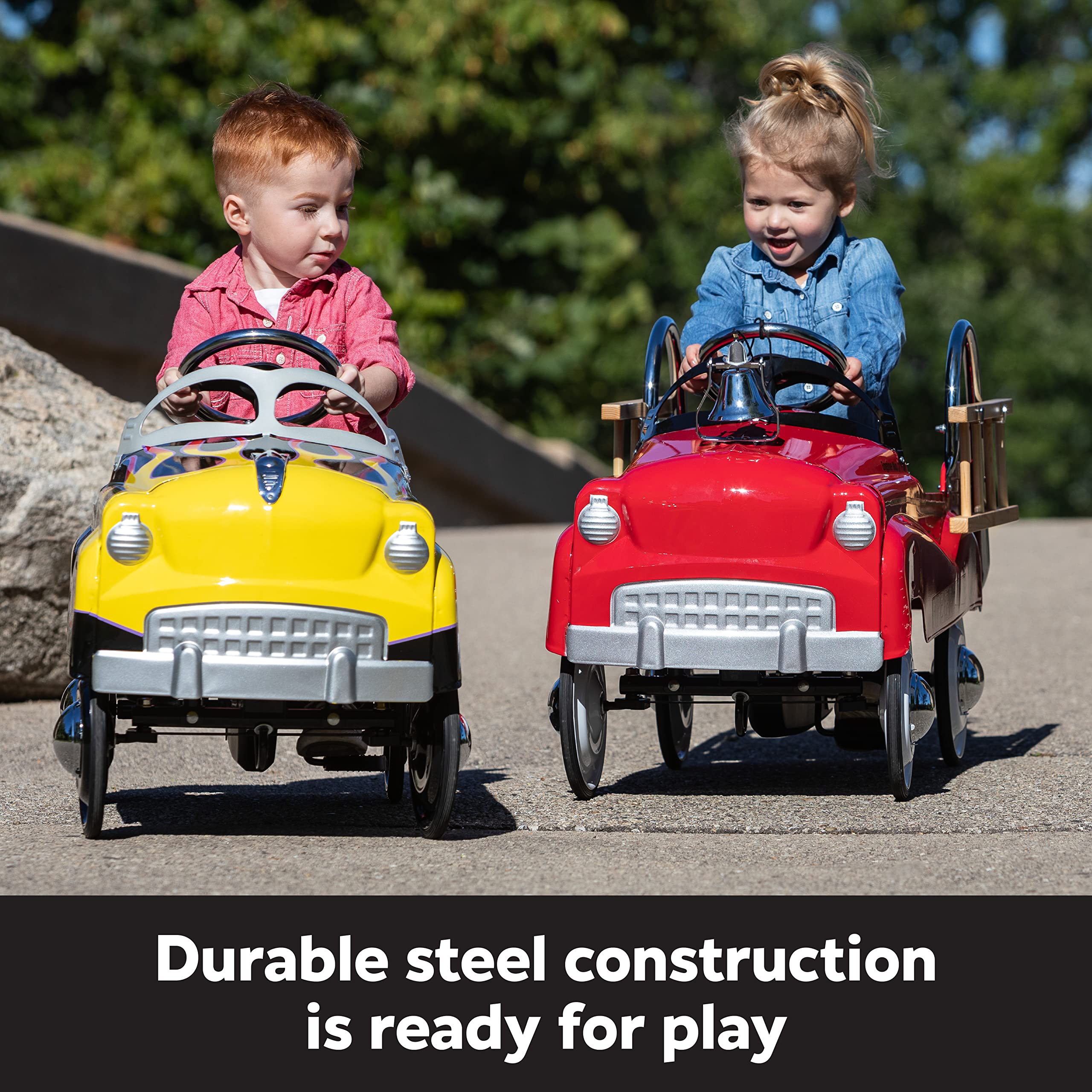 - Classic fire truck pedal car for sidewalk and driveway fun; Seats one rider, ages 3 and up, with a maximum weight limit of 59 lb