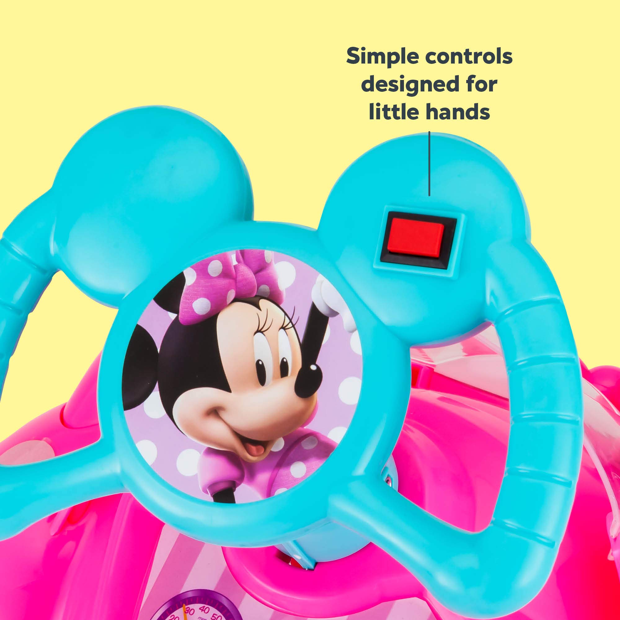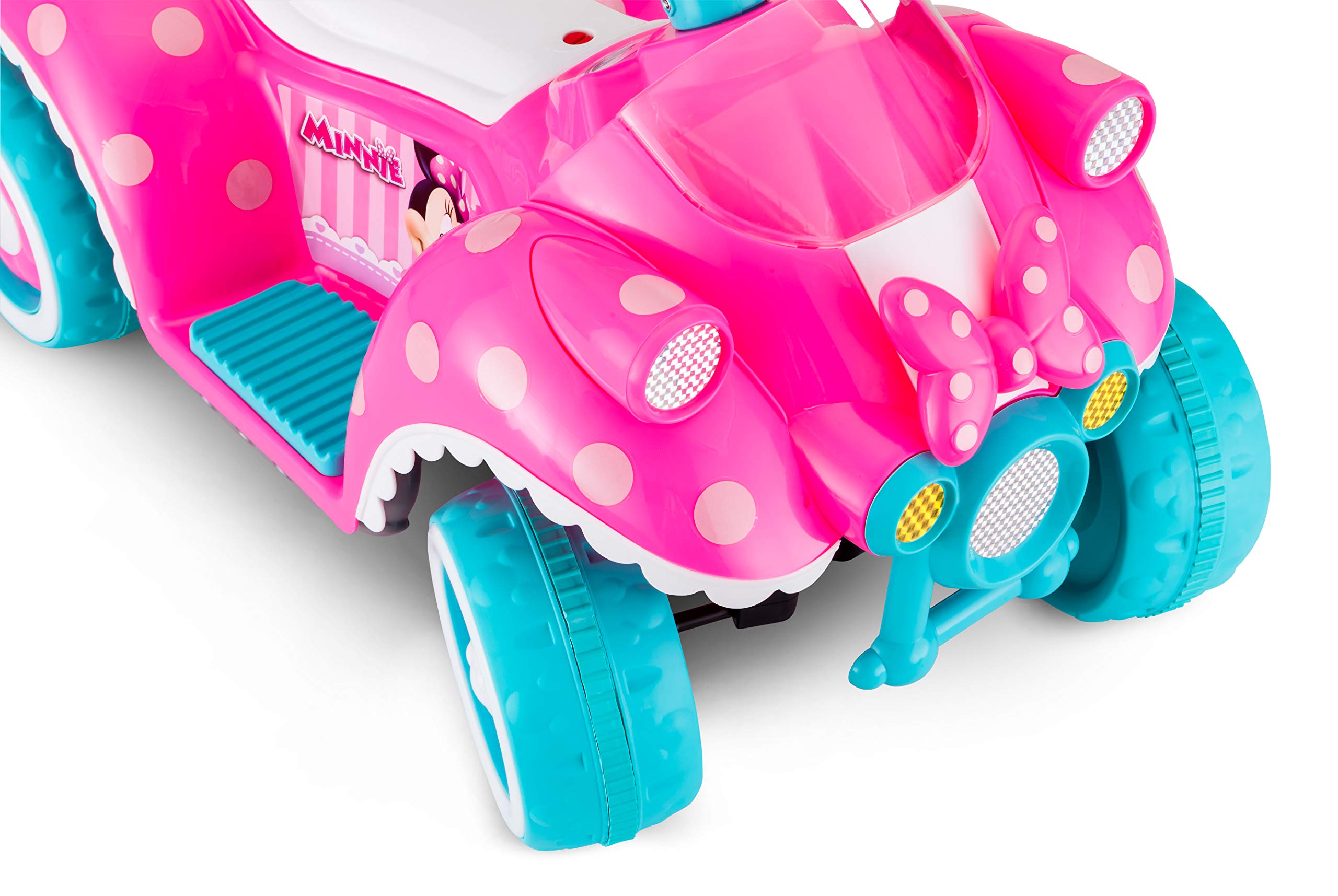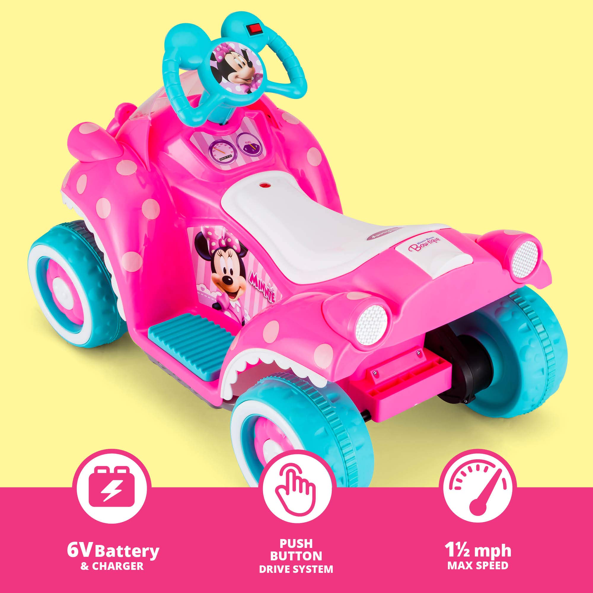 - Ride in style with this unique Disney Minnie Mouse themed hot rod styled 6V battery powered ride on toy from kid trax