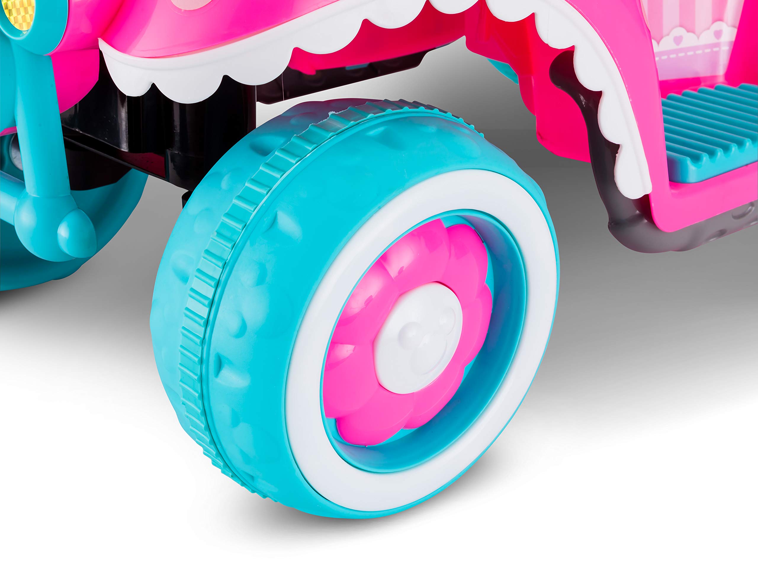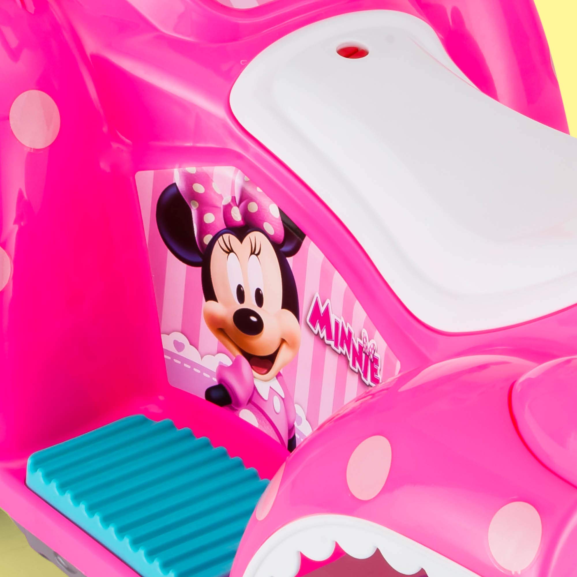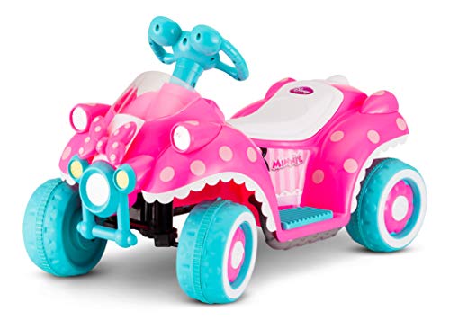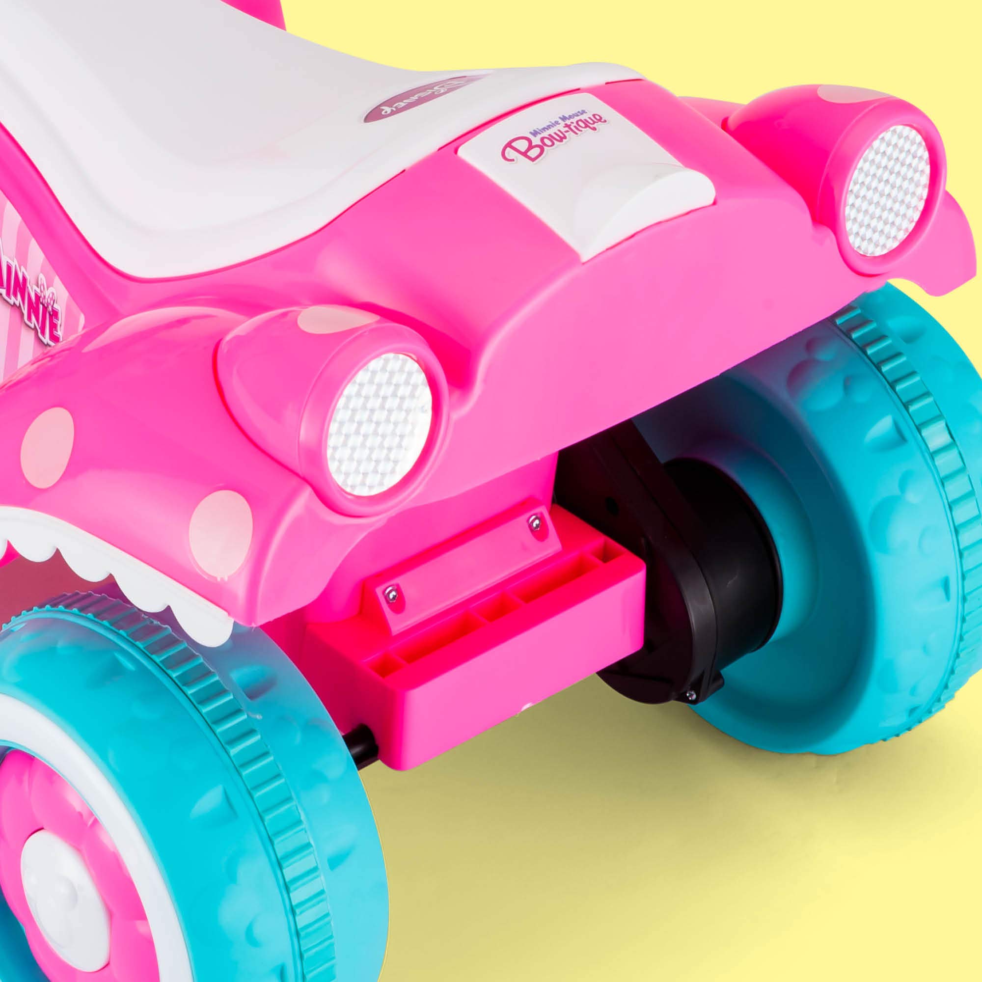 - Ride in style with this unique Disney Minnie Mouse themed hot rod styled 6V battery powered ride on toy from kid trax
