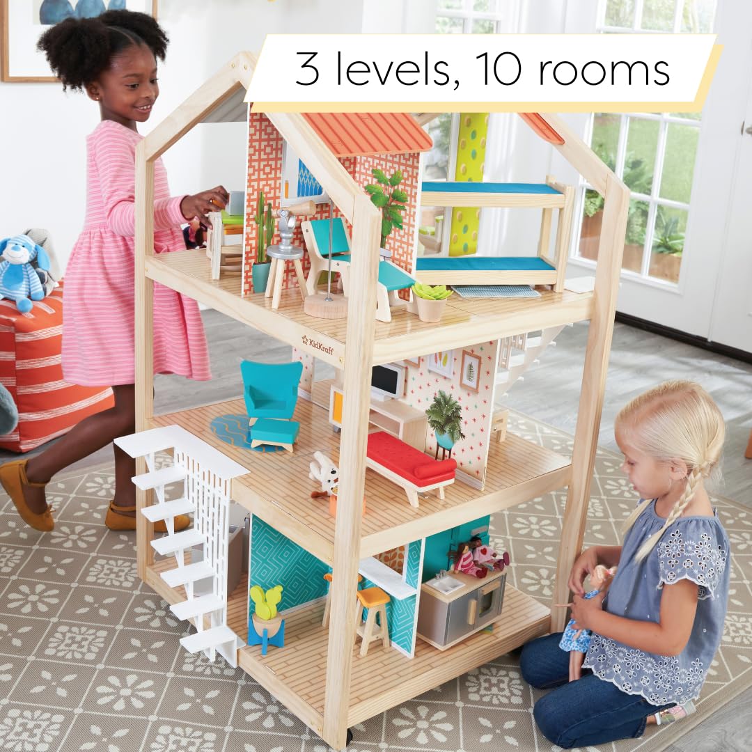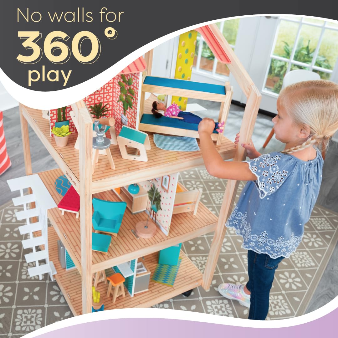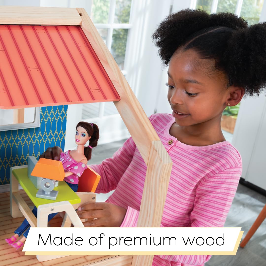 - MID-CENTURY DESIGN: Full of bright bold colors and trendy patterns, this dollhouse has a mod style that really stands out.
