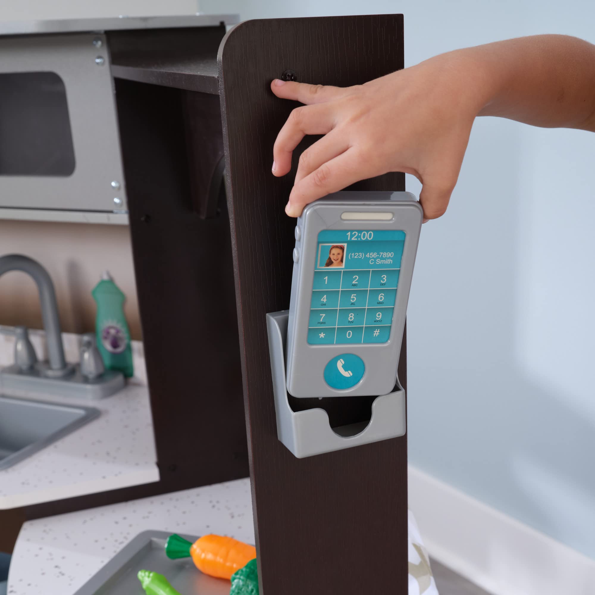 - SO DETAILED: Kids will find plenty of hands-on learning with buttons to press, knobs to turn and handles to pull. And, with homey touches like fabric curtains, a wall phone and lots of storage, this wooden kitchen is almost just like the real thing!
