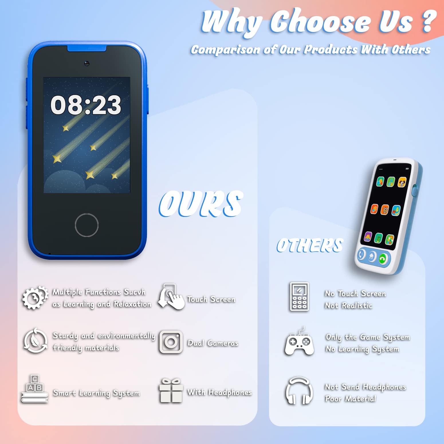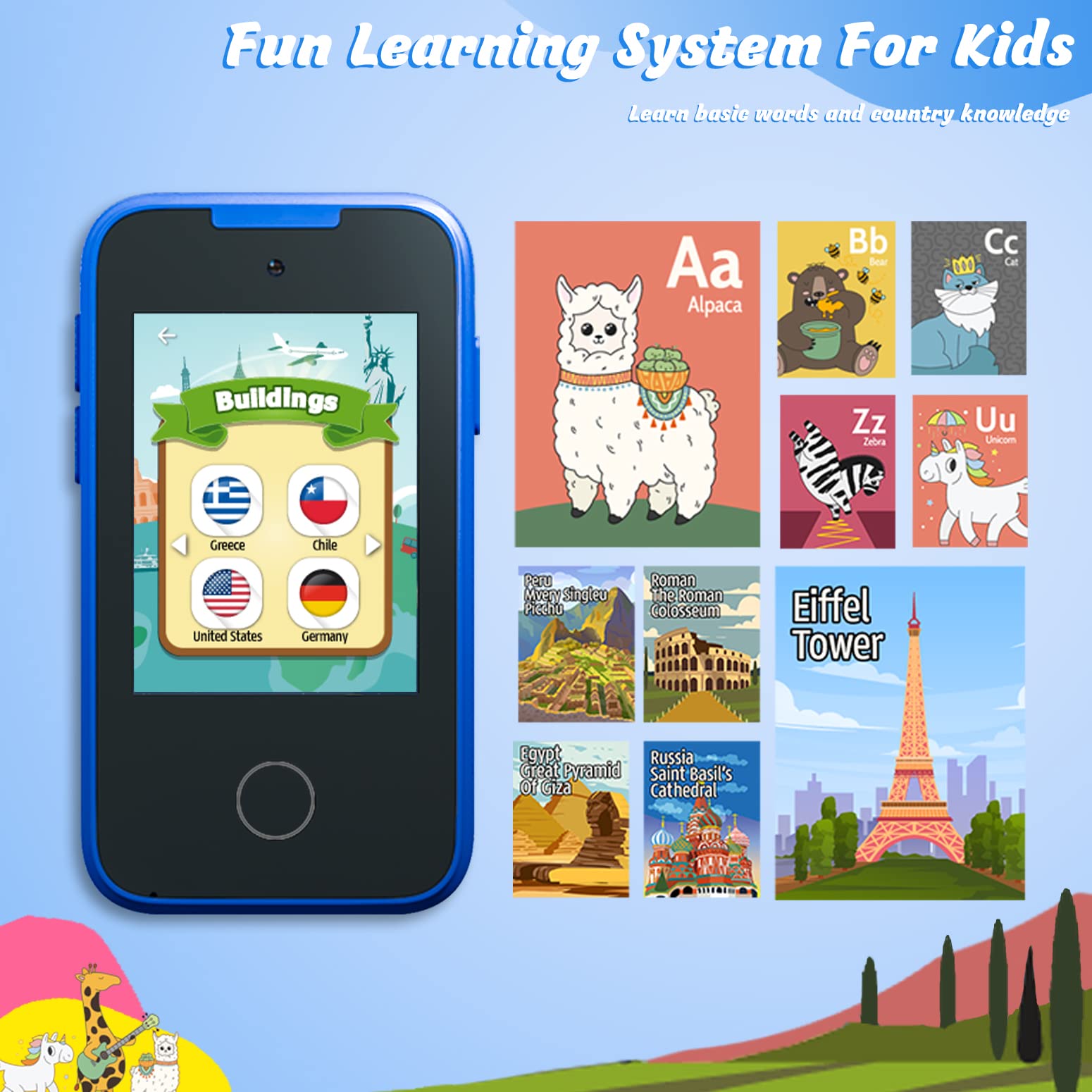 - u3010Smart and Practical Phone for kidsu3011The baby cell phone toy is equipped with an ultra clear sensitive touch screen to let your kids play and play better. 8GB mini SD card allows you to store more pictures. It supports English, French, Spanish, Italian German and Russian, 3.5 headphone interface. Built in large capacity battery, it can be used continuously for 4-5 hours after full charged, which is very practical and user-friendly.