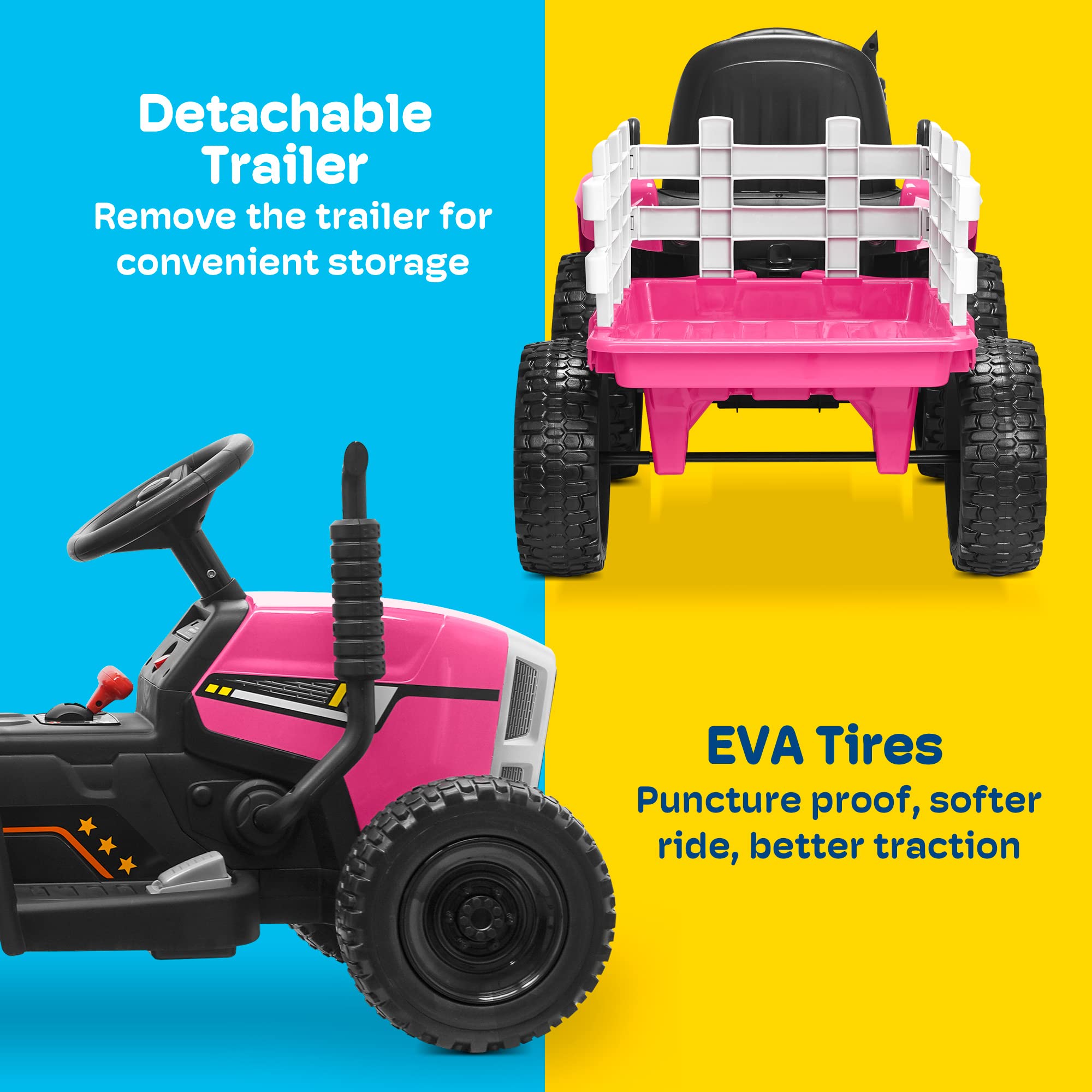 - [DETATCHABLE TRAILER] Includes a detachable trailer that can not only store some small toys and snacks but also allow kids to drive in the backyard or garden and carry tools garden supplies for more fun.