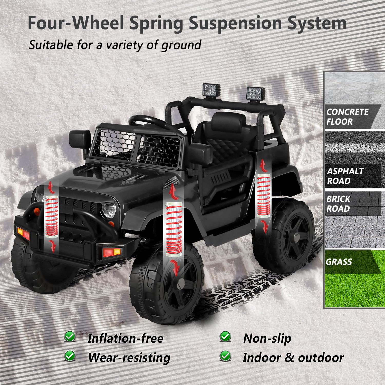 - u2764SAFETY CERTIFICATION: The adjustable seat belt and double lockable doors keep your child safe. The non-inflatable wheels are suitable for all kinds of terrain and can be used outdoors or indoors. Equipped with spring suspension system to ensure children's smooth and comfortable driving. Soft start function prevents children from being startled by sudden acceleration or braking.