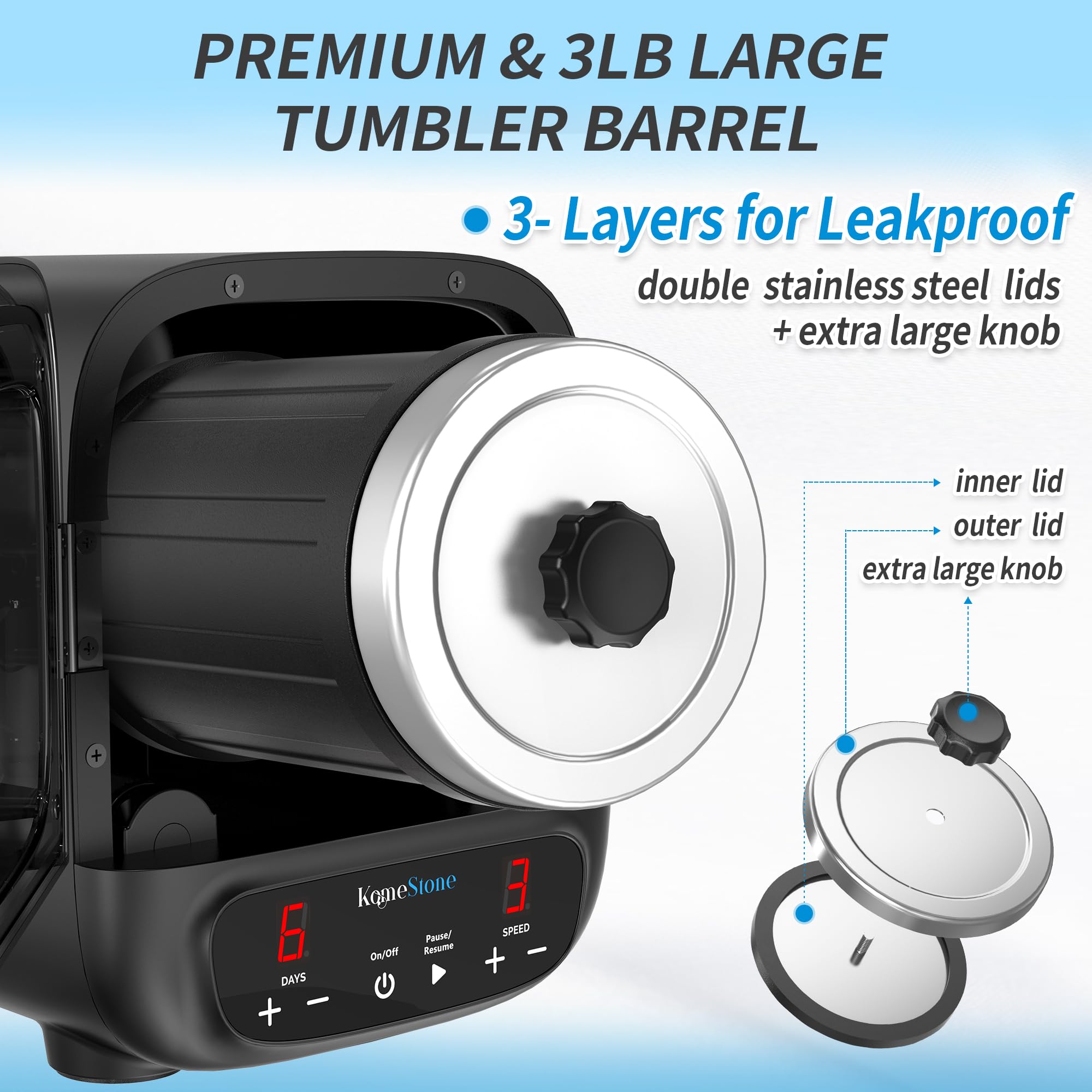 - 3 LBS EXTRA LARGE CAPACITY & ULTRA QUIETER: Our rock tumbler features 100% soft rubber barrels that effectively absorb the impact of tumbling rocks, resulting in an ultra-quiet operation comparable to a working dishwasher. The generously-sized 3 lbs barrel allows you to polish a larger quantity of rocks in each batch.