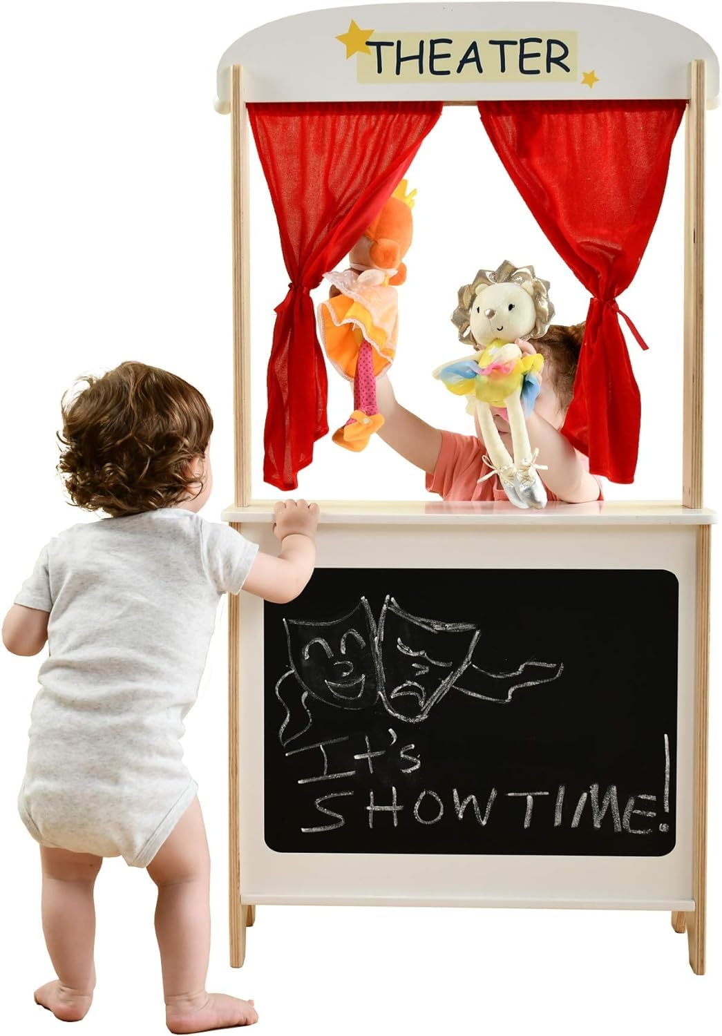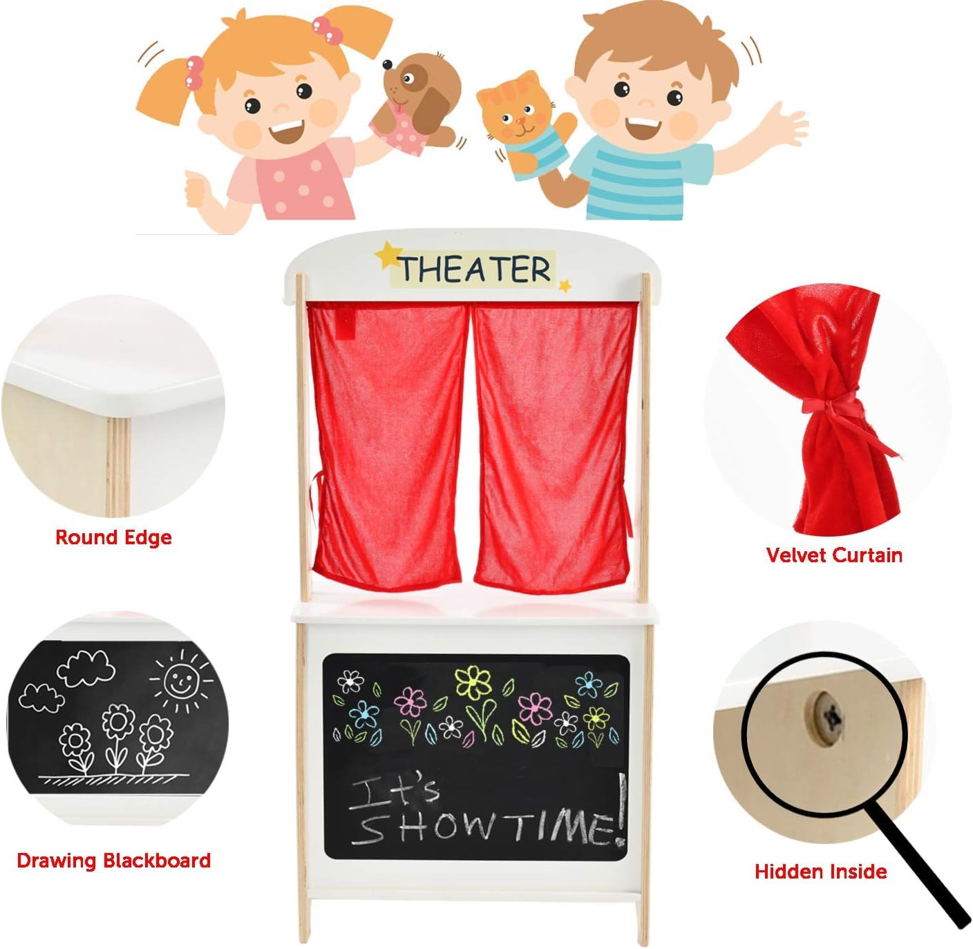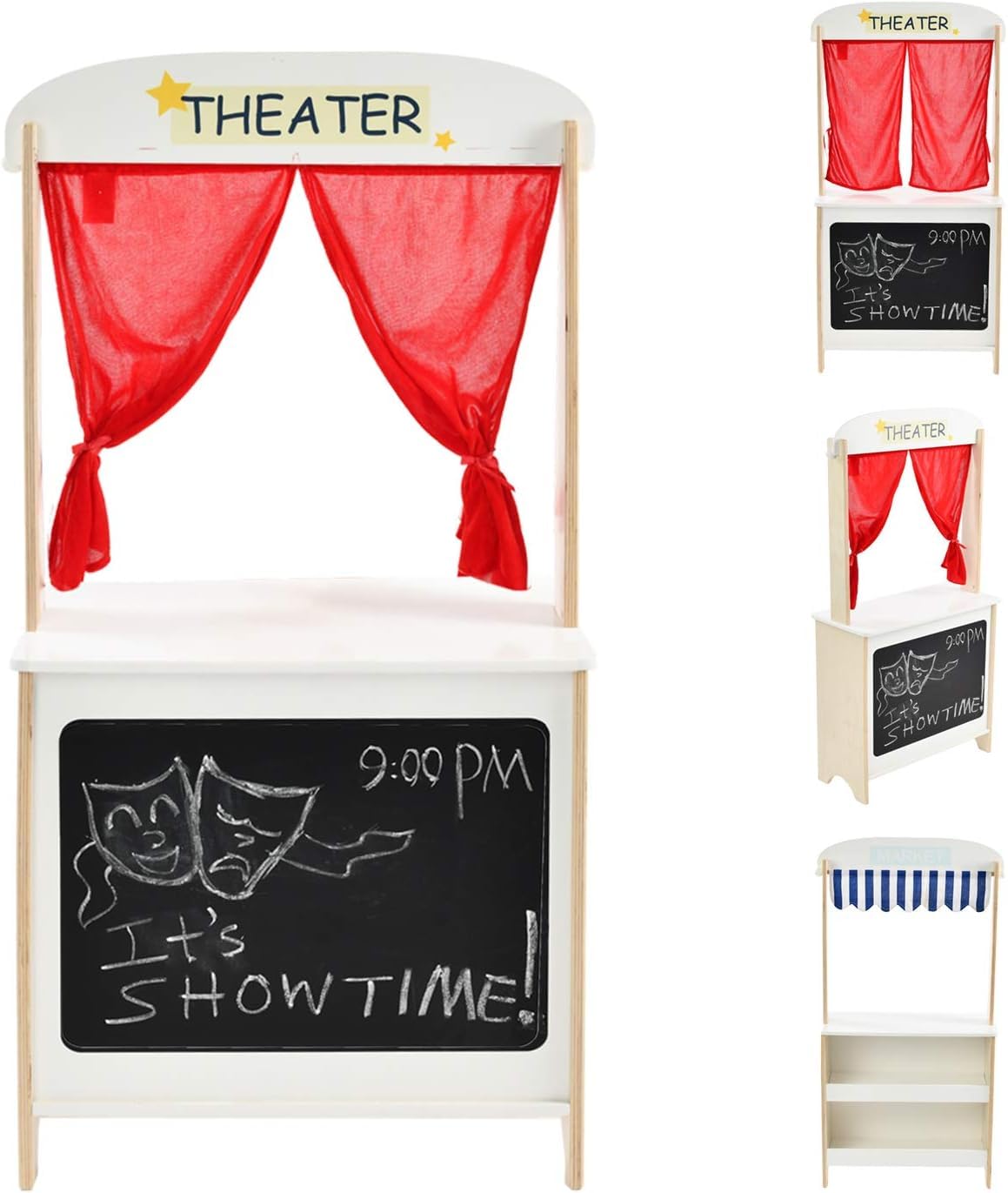 - [ Multifunction Theater ] - This is a colorful little theatre with a blackboard and red velvet curtains (like a real theater). Child can pull the curtain back to prepare for the performance, write the time and content of the show on the blackboard. On the other side as a game store, children can put their toys on the shelf, pretend to buy and sell toys, children can enjoy some dramas from puppets and this lovely wooden theater, they can also enjoy the fun of buying and selling goods.