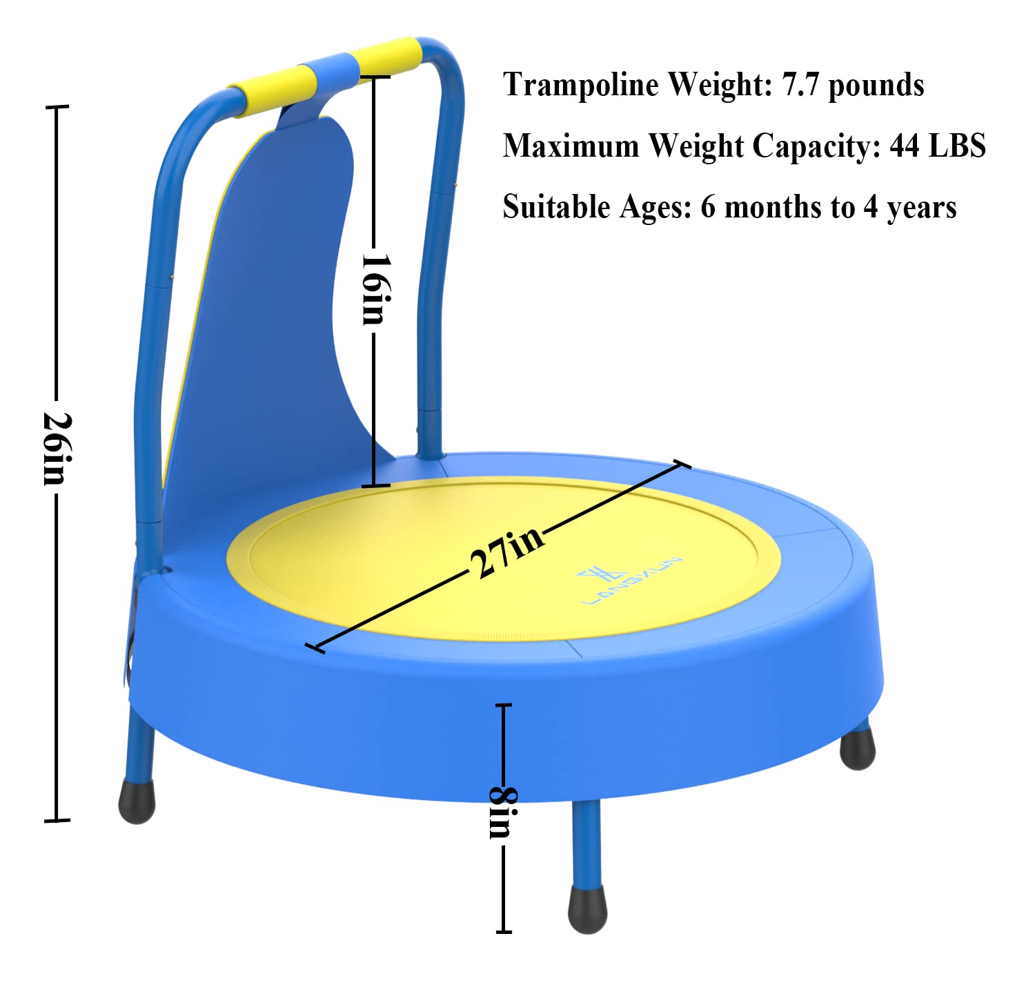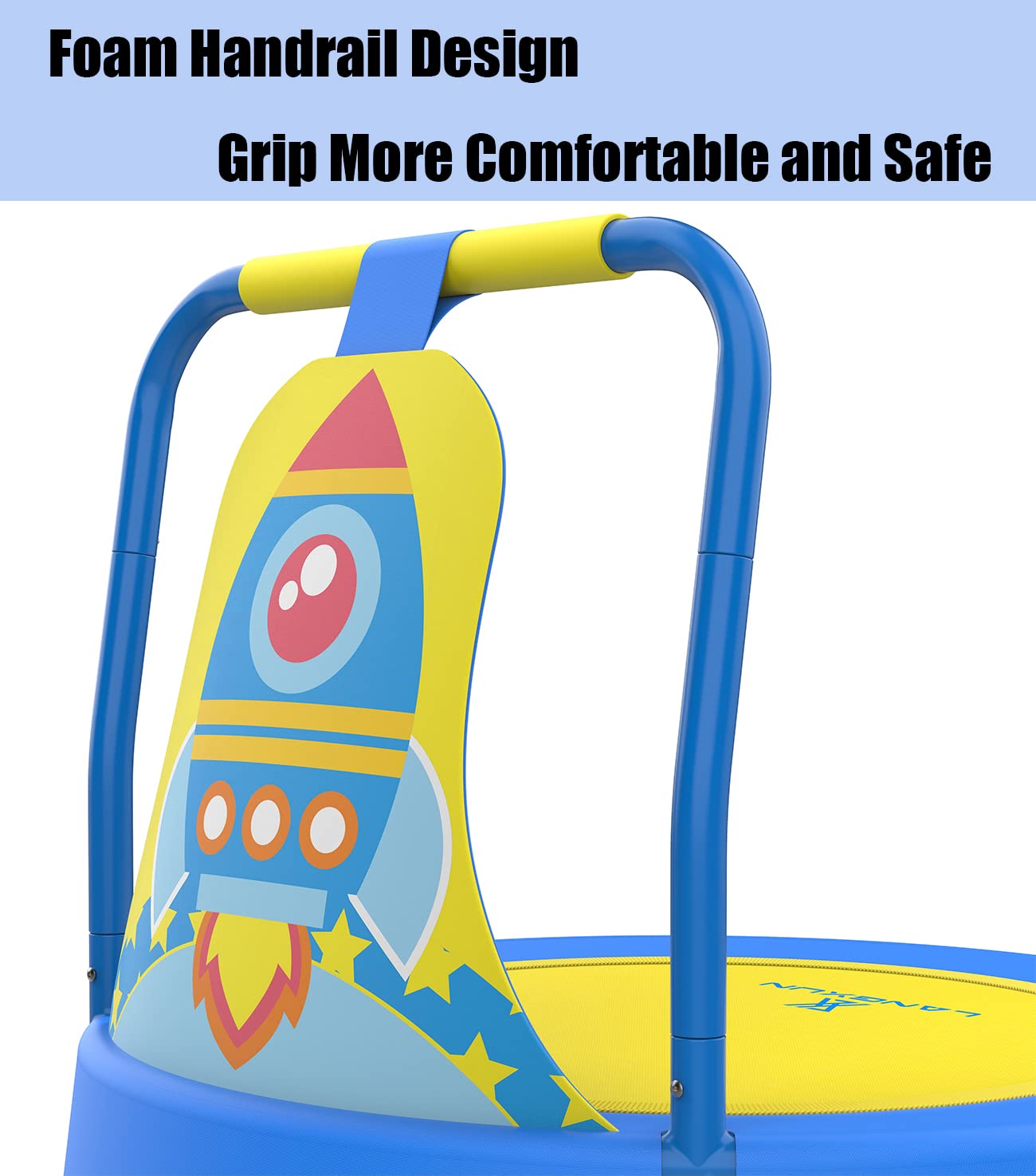 - Designed for Baby & Toddler - This is a safe trampoline designed for young Kids. Ergonomic handrails, curved inward and foam wrapped, provide stability when kids jump and prevent bumps and bruises. Non-slip rubber soles ensure stability and comfort for bouncing fun.
