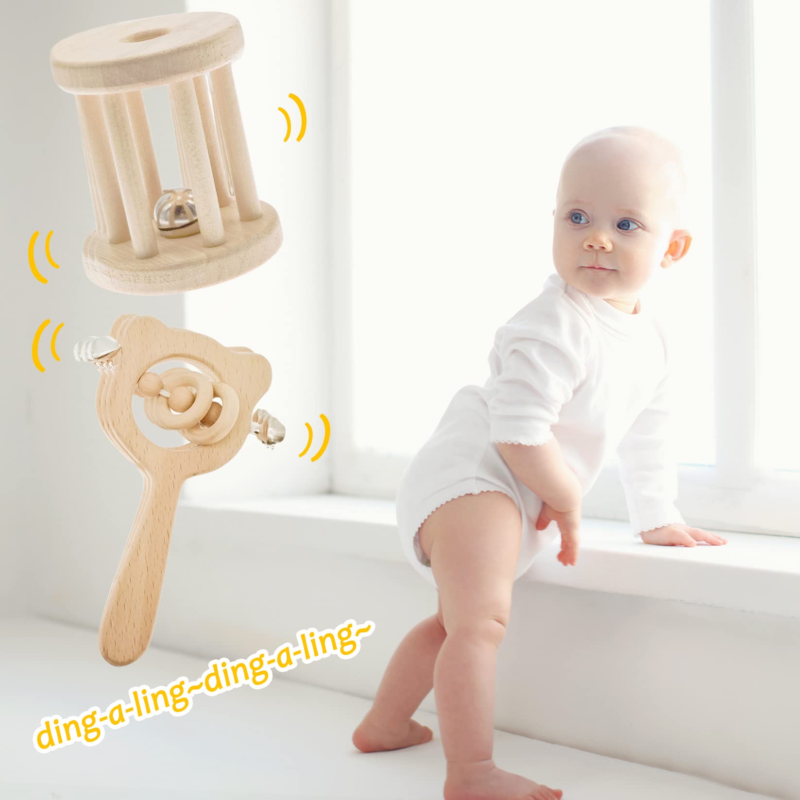 - SENSORY TOYS - Wood and bells crashing to make a comforting sound, it can help nurture baby's auditory development. and also stimulate baby's music cells. Anf the soft clinking sound of the wooden rattle makes the baby feel happy and stops crying.