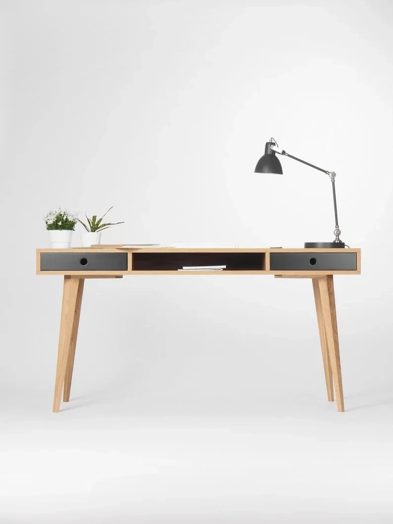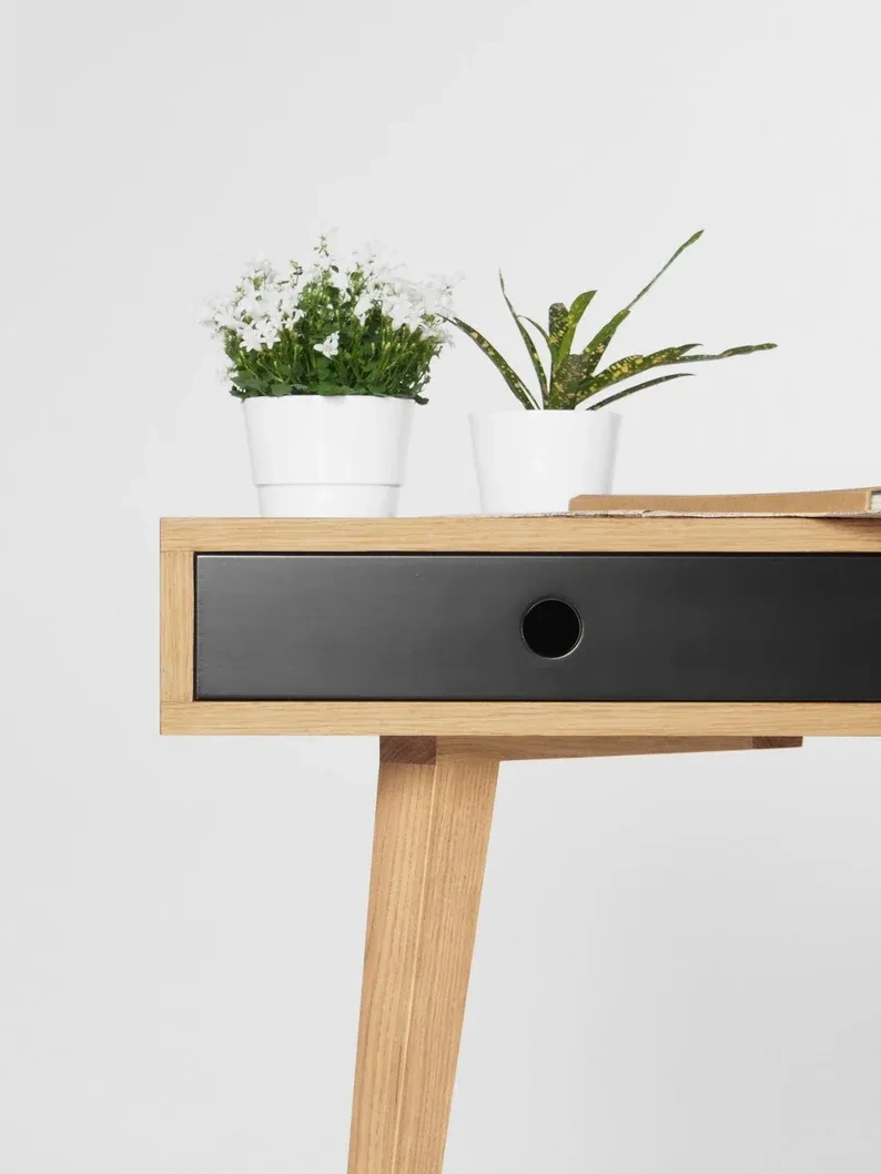 This desk has been inspired by mid-century modern Scandinavian design. We aimed to develop a piece of furniture that is not only beautiful but also functional - we have equipped it with storage areas: compartment and drawers. Our desk made of solid oak wood and wood covered with natural oak veneer has been perfectly finished with hardwax oil. With the geometric design of legs, furniture creates an incomparable and unique form. The desk comes in a choice of finishes: different type of front available (solid oak, black mat, white mat).