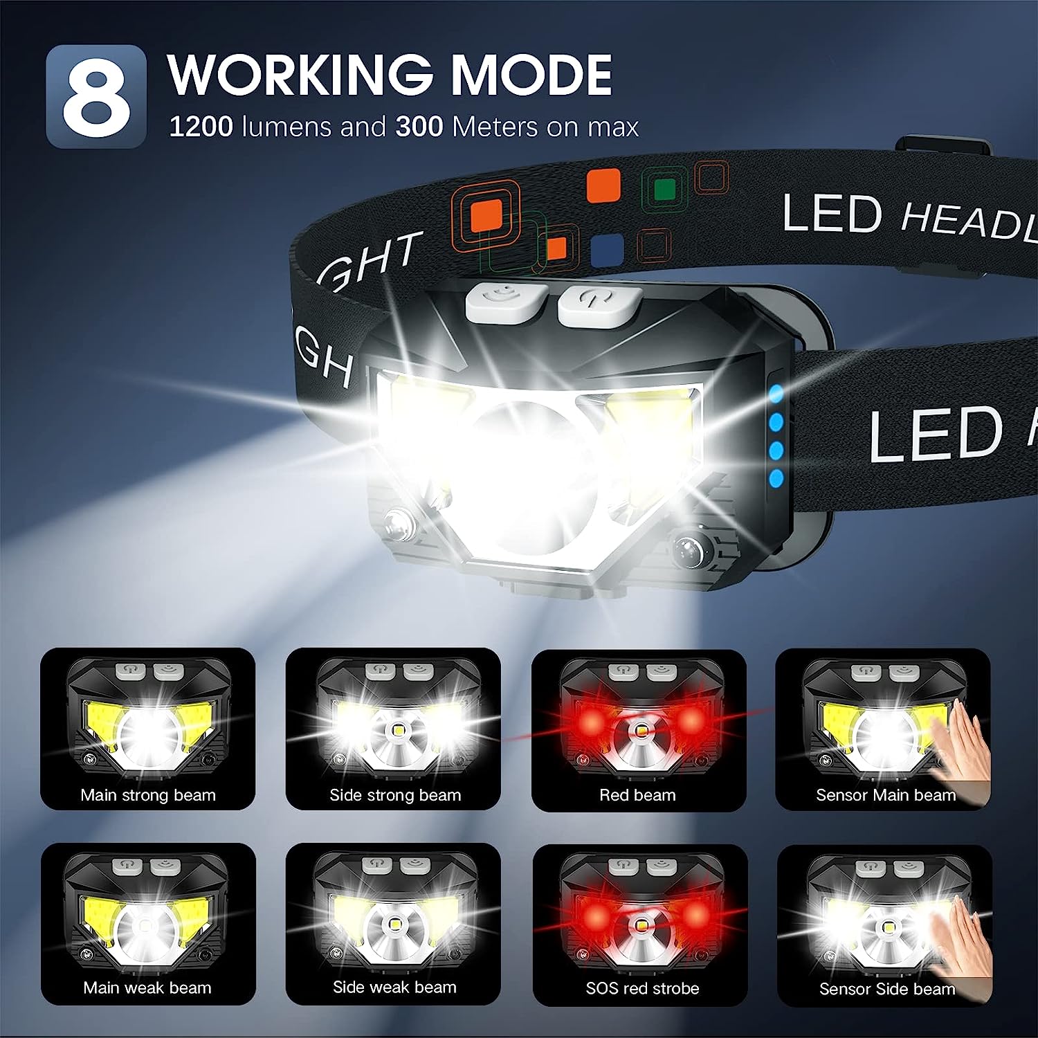 - 🏃 ✅Waterproof and 8 Modes: The headlight has IPX4 waterproof rate. The high-quality shell is more sealed and leak-proof, which is suitable for rain or snow, indoors or outdoors. The led headlamp has 8 lighting modes to meet your various needs. ①In key light mode, you can switch the main strong beam, main weak beam, side strong beam, side weak beam, red beam, SOS red strobe. ②In motion sensor mode, you can switch the main strong beam and side strong beam.