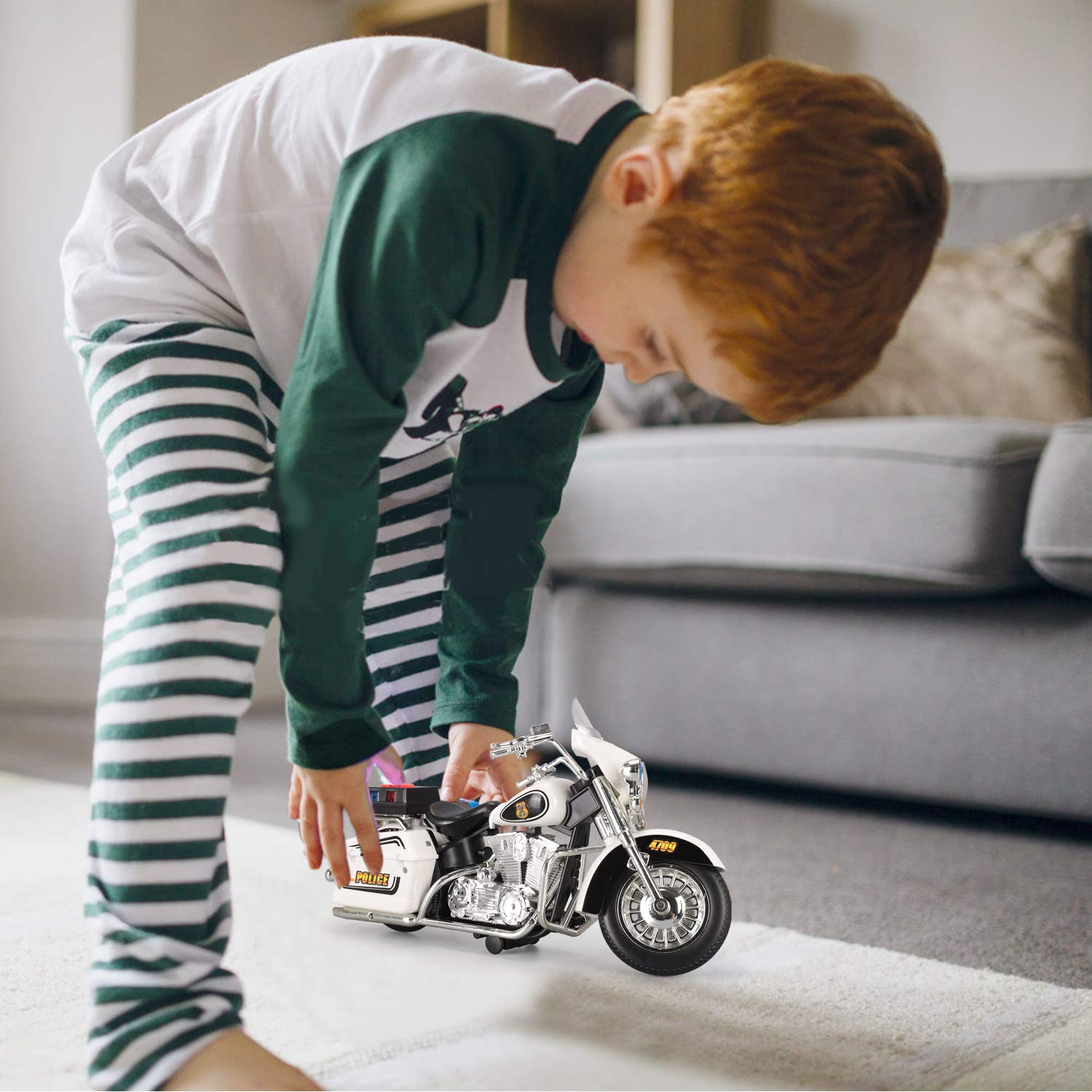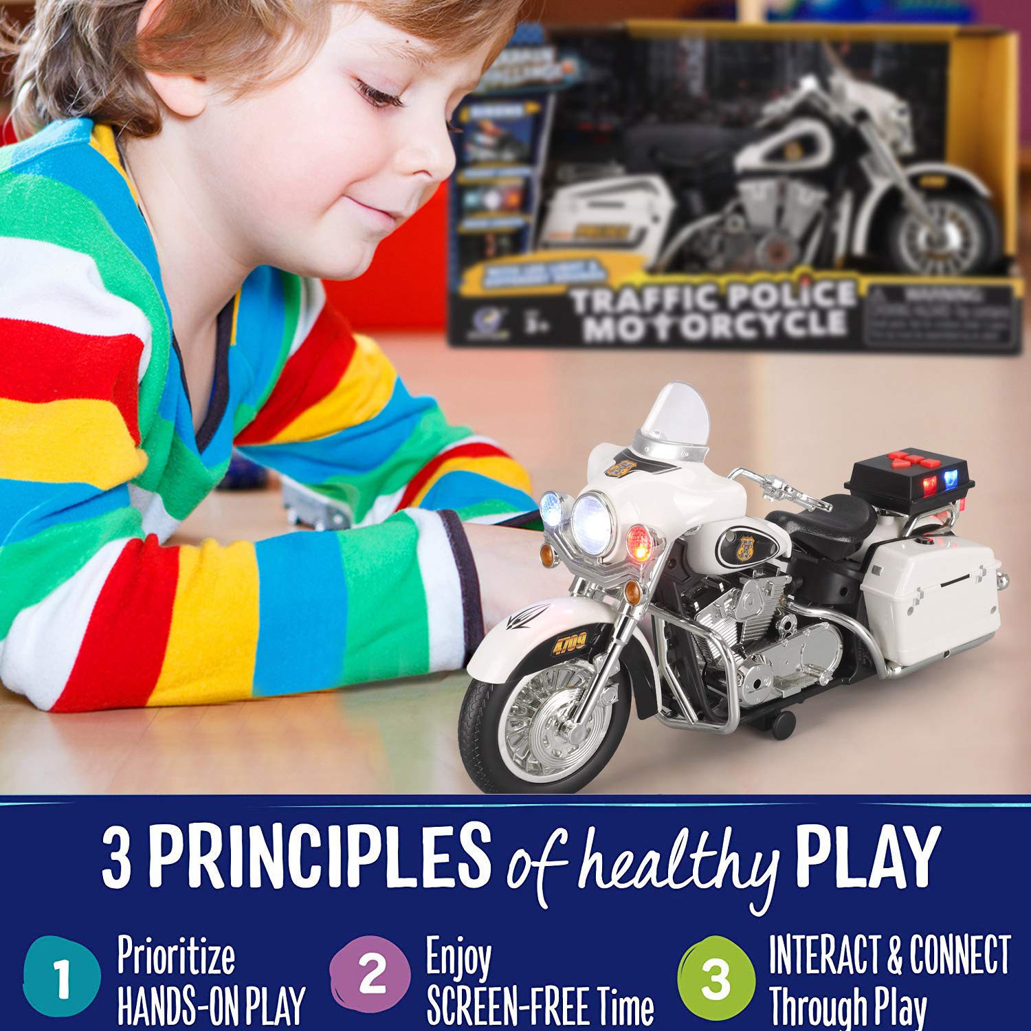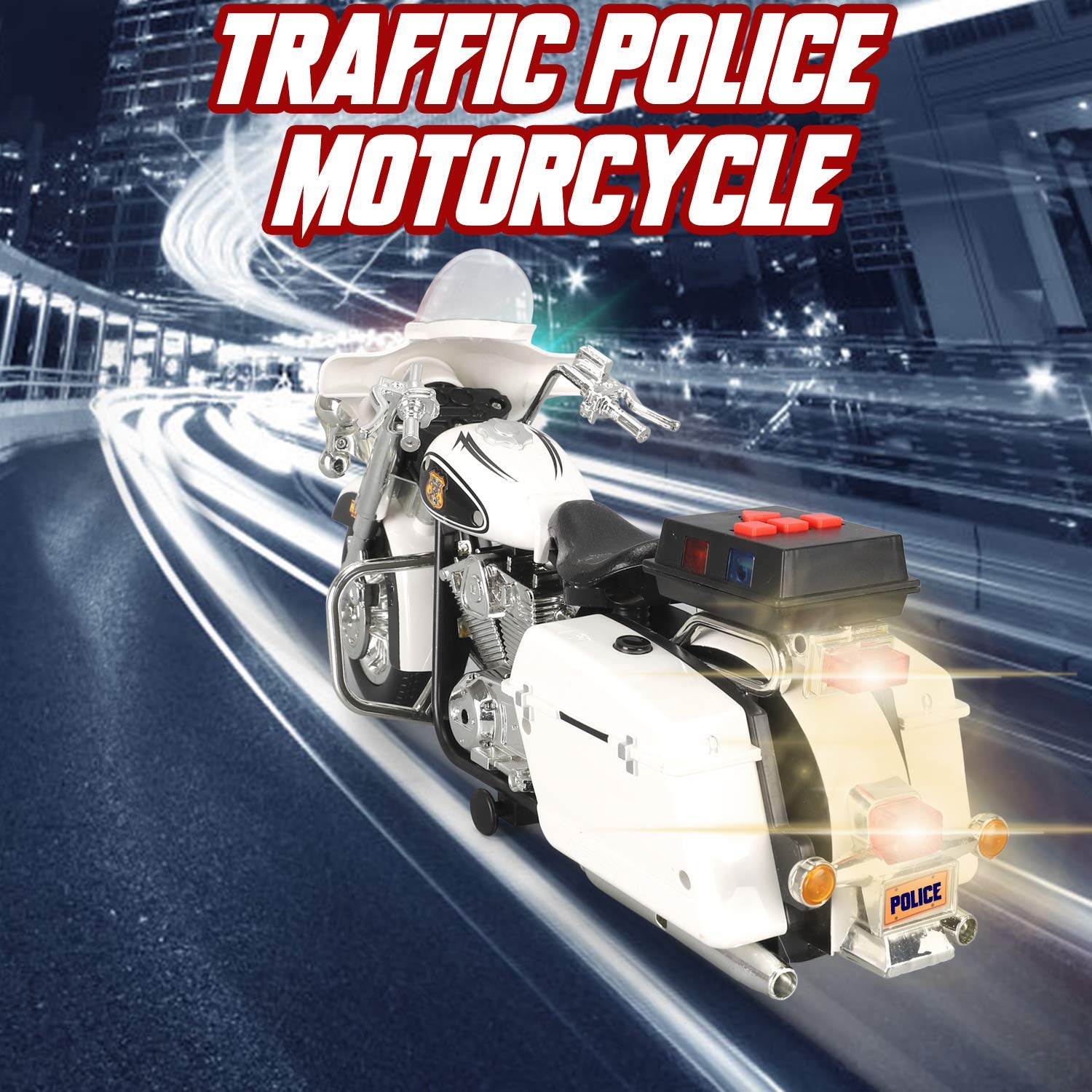 - u2705 FLASHING LIGHTS: Battery operated Police Patrol Motorcycle features realistic detailing and flashing LED headlights, hazard lights and signal lights.