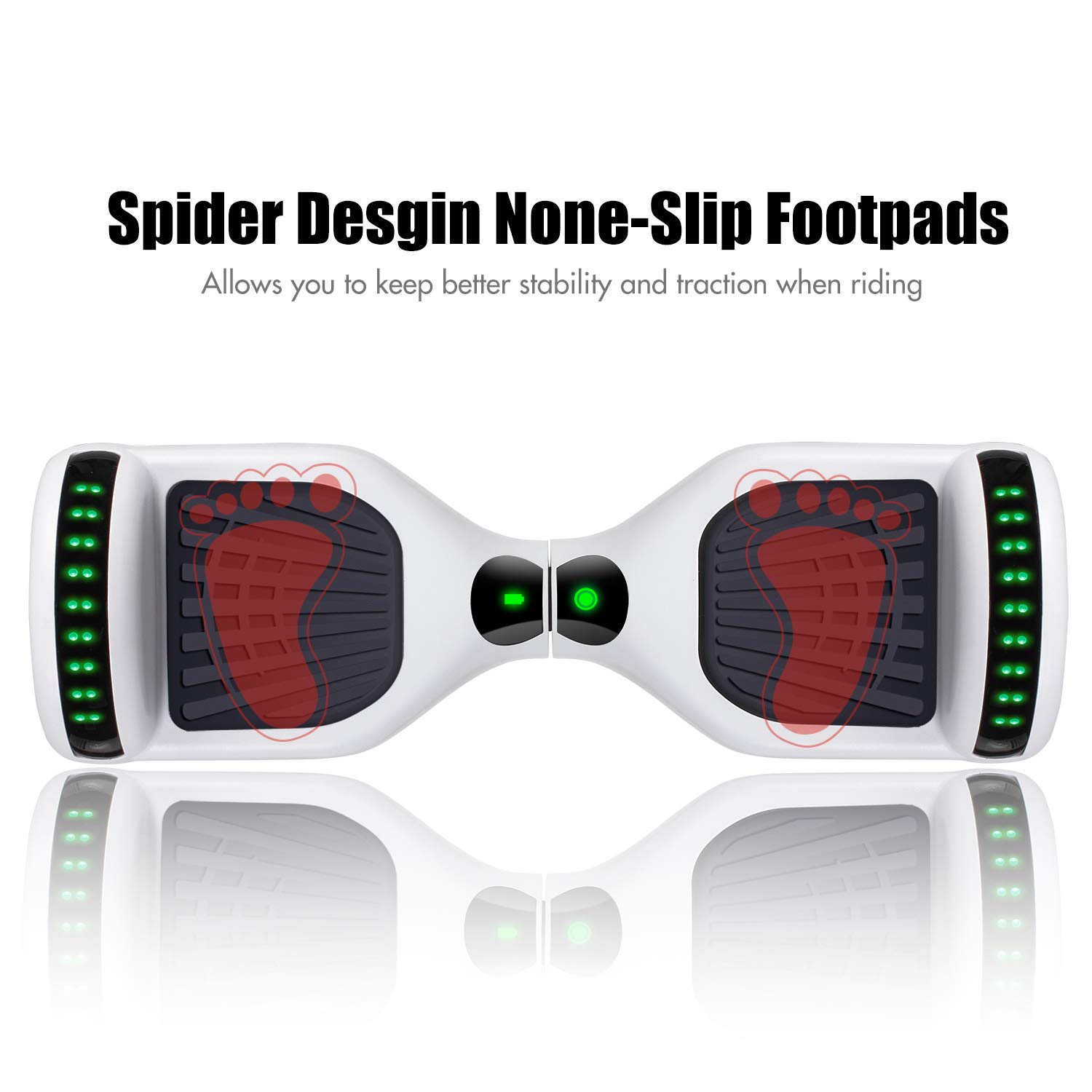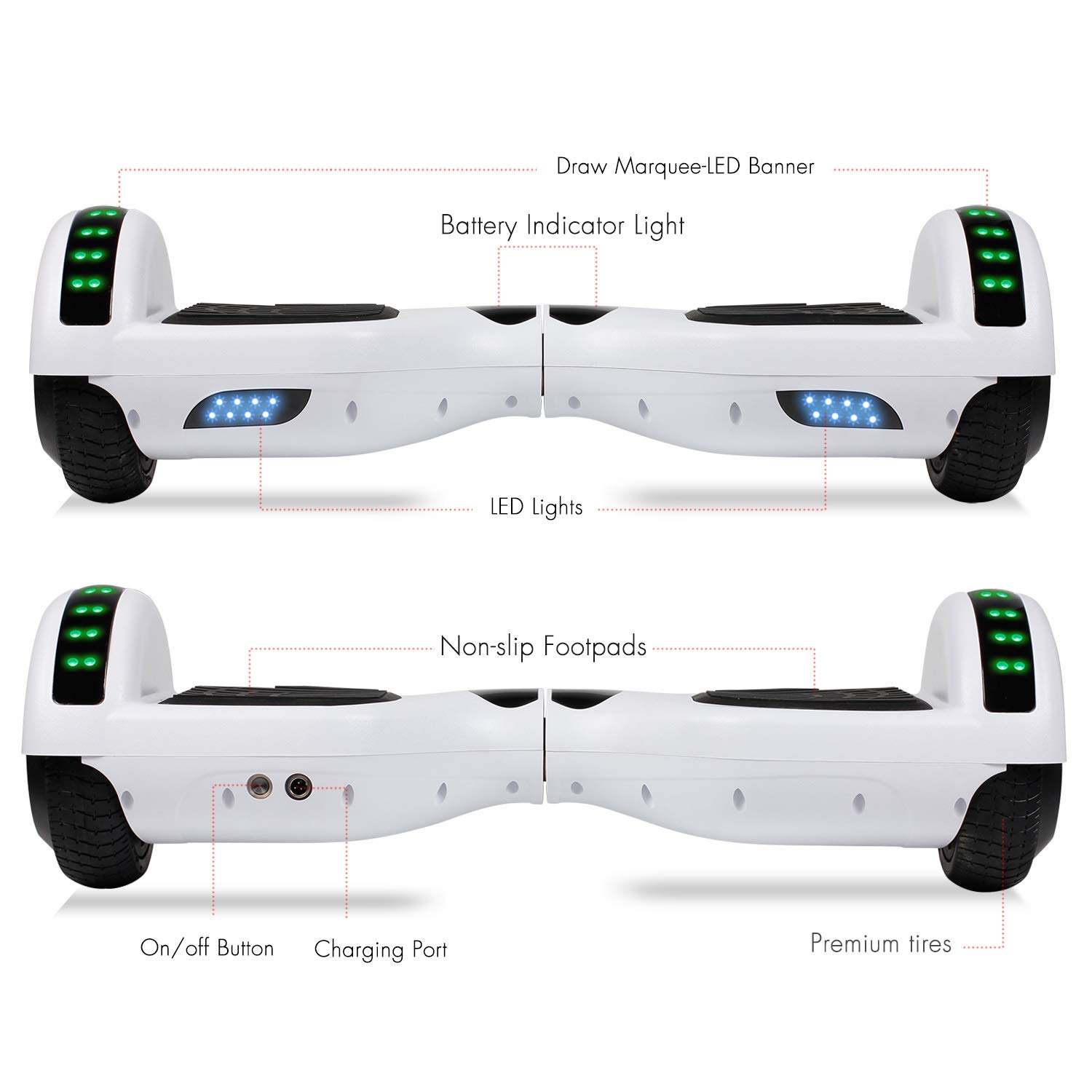 - 6.5 Inch Wheels : High intensity Led headlights provide you safer ride at night, now you can ride it to anywhere at any time. Awesome LED design with color lights, give you a colorful experience.
