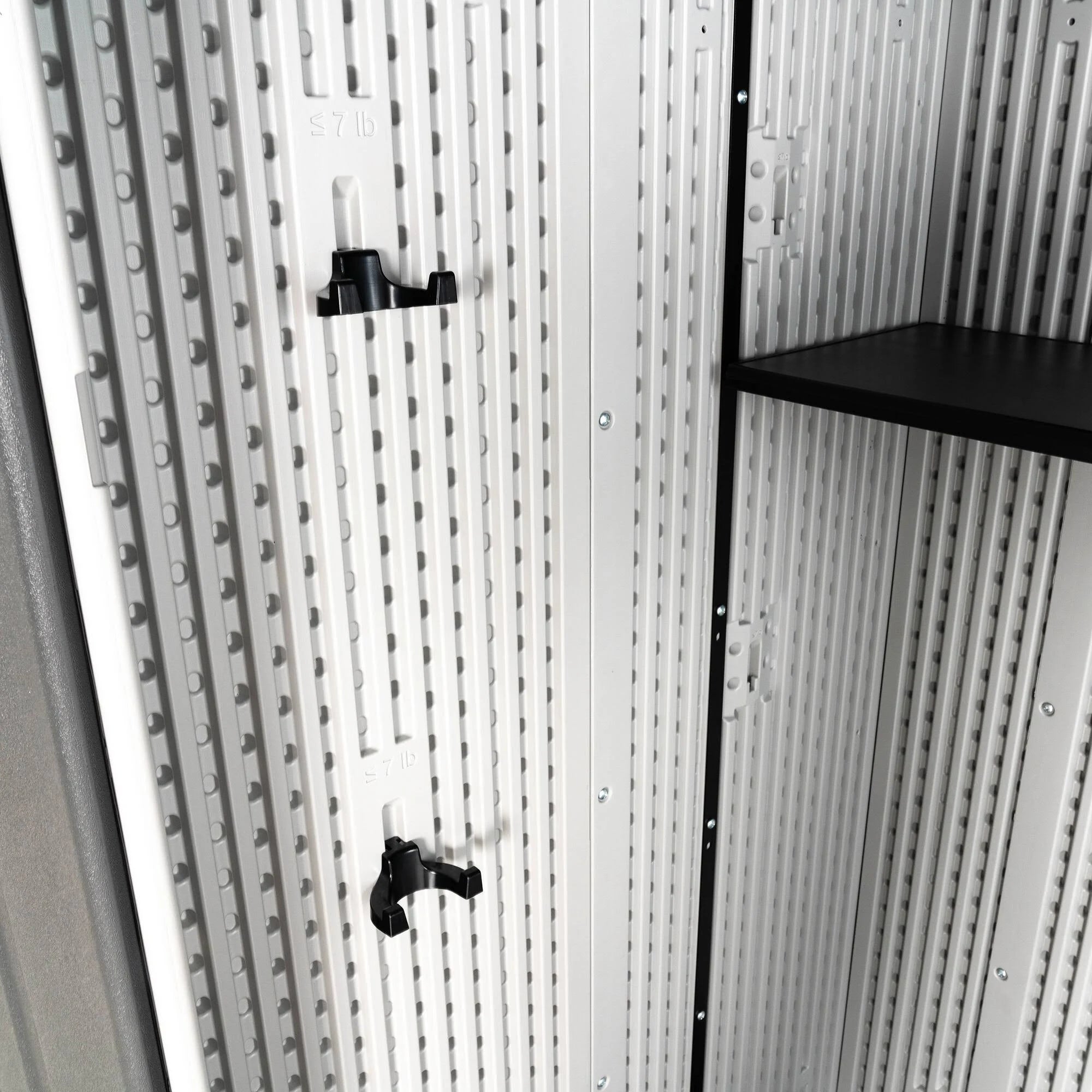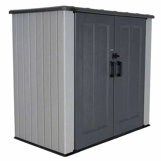 Decluttering your garage and maintaining your yard can be a challenging job. Between all the tools for the upkeep of your yard and the different objects taking up valuable space in your garage, you need the right solution to keep everything organized. The Lifetime Utility Shed is a mid-sized storage solution for households in need of extra storage space. It is large enough for residential garbage containers, lawn mowers, and bikes, but also equipped with shelving and removable wall hooks for smaller items such hand tools, power cords, shovels, and rakes. The double-hinged doors fully open making it convenient to move items in and out of the shed. The slider lock and deadbolts (lock not included) allow you to keep your belongings safe and secure. With the Lifetime Utility Shed, you can free up valuable space in your garage and keep outdoor equipment organized. This shed comes in two-tone gray.
