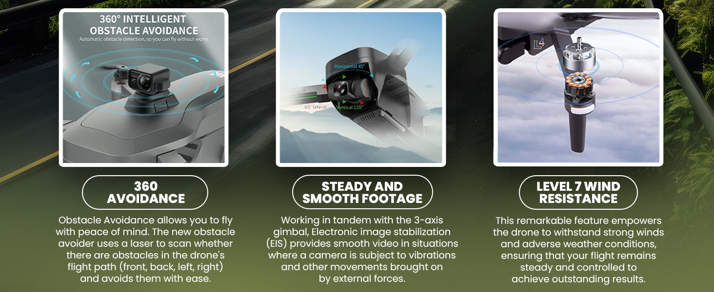 - CINEMATIC 4K UHD VIDEO & SMOOTH 3-AXIS GIMBAL: With a 3-axis gimbal and 4K UHD resolution, get super-smooth, pro-quality footage. Enhanced EIS delivers added stability, and dual cameras provide versatile shooting angles. Our drones with camera and video features, allow you to instantly view and share your content on your smartphone via wireless transfer.