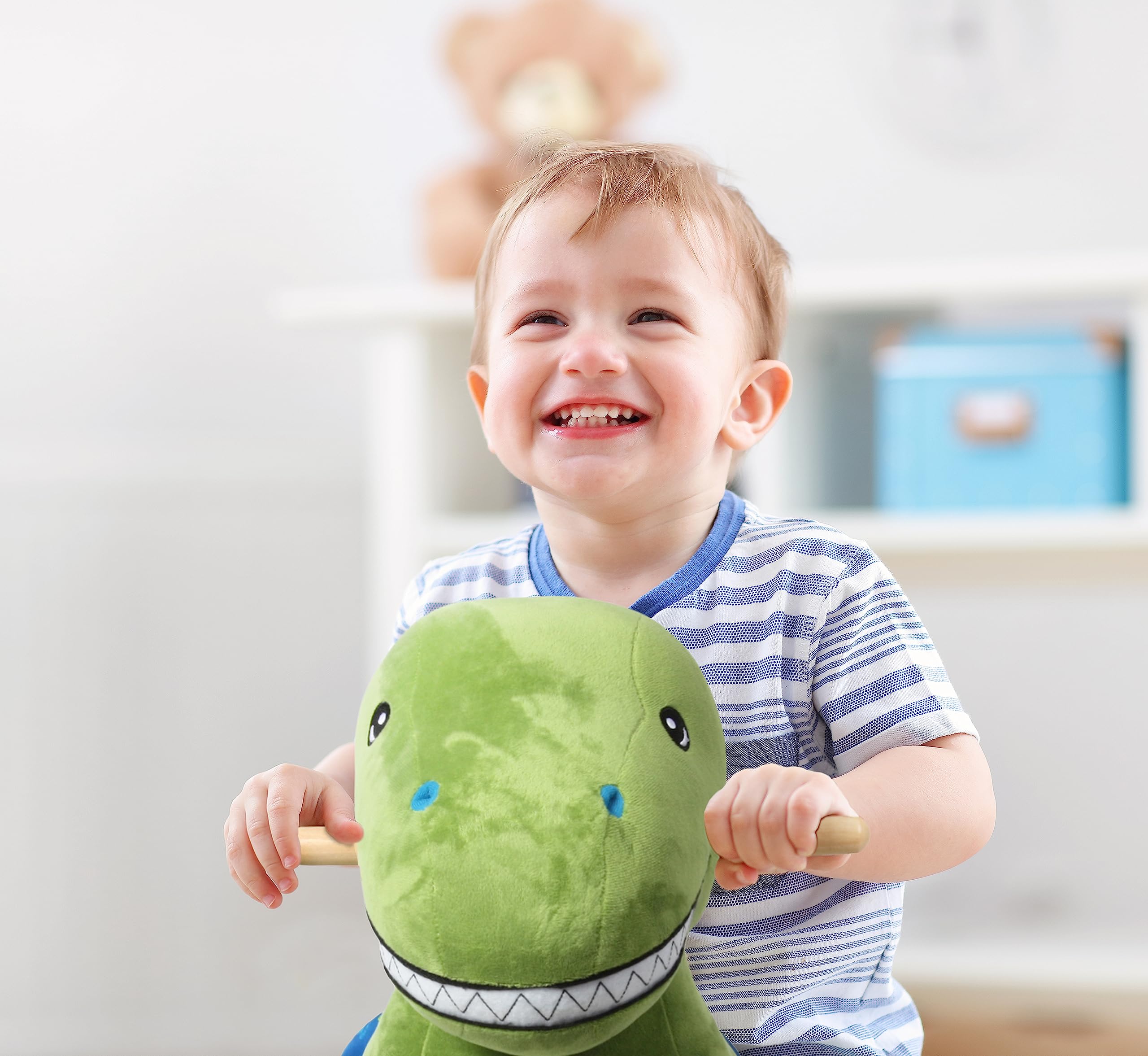 - Comfort: The DinoRocker stimulates your child's sensory perception through its soft and plush fabric, providing tactile stimulation. The dino's textured features offer opportunities for exploration and sensory discovery, contributing to your child's sensory development.