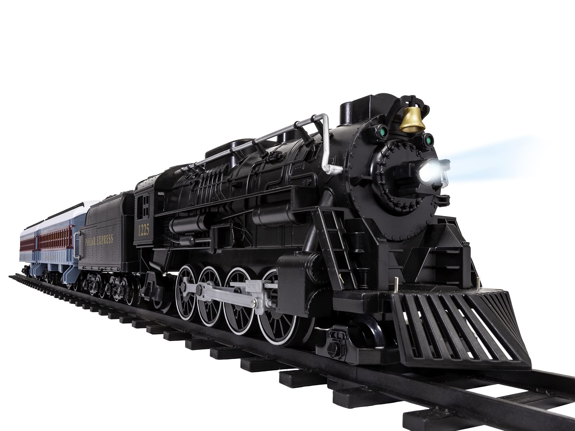 - Set Includes: Battery-powered steam locomotive and tender, Passenger coach, Observation car, 24 curved and 20 straight plastic track pieces, RC remote control