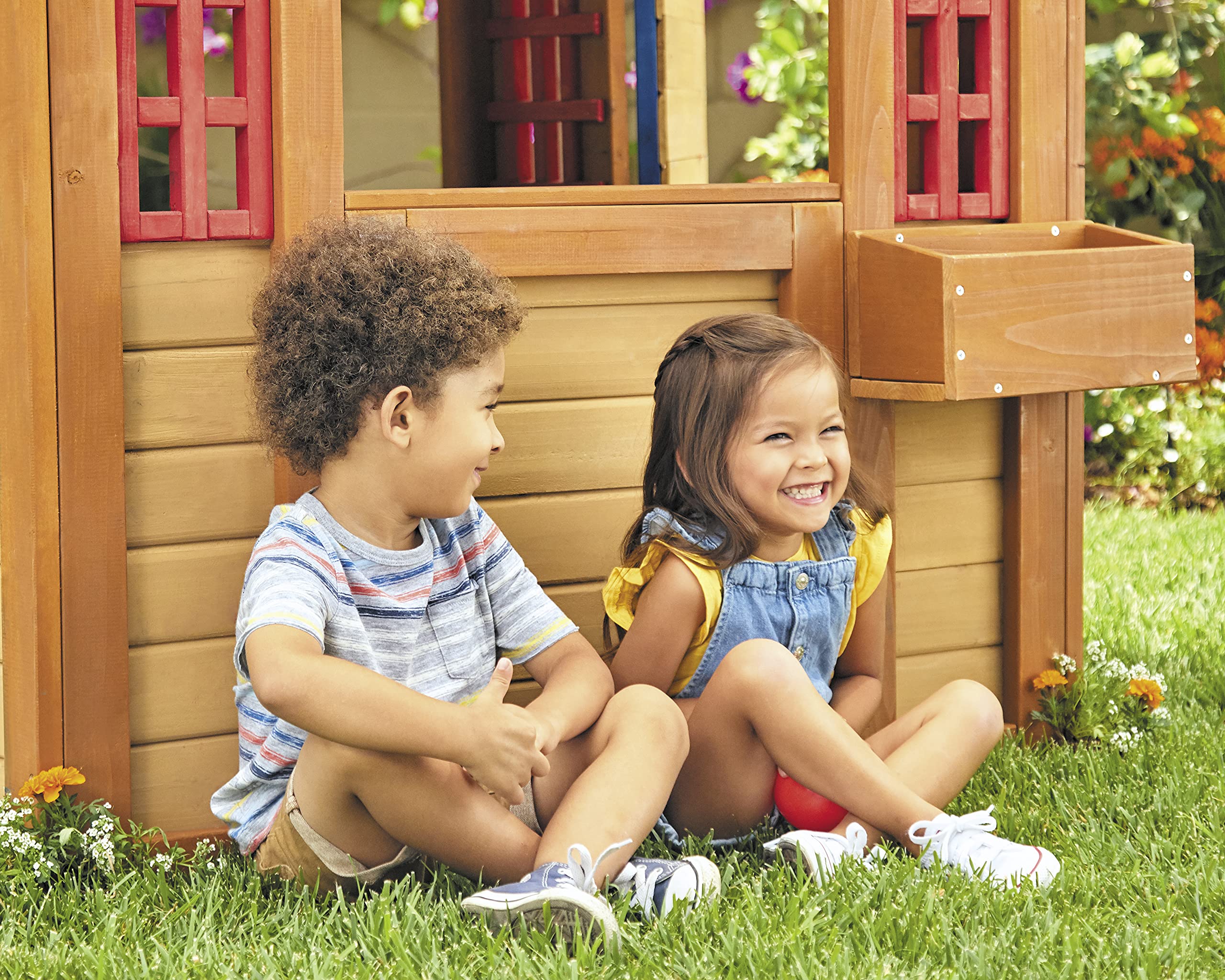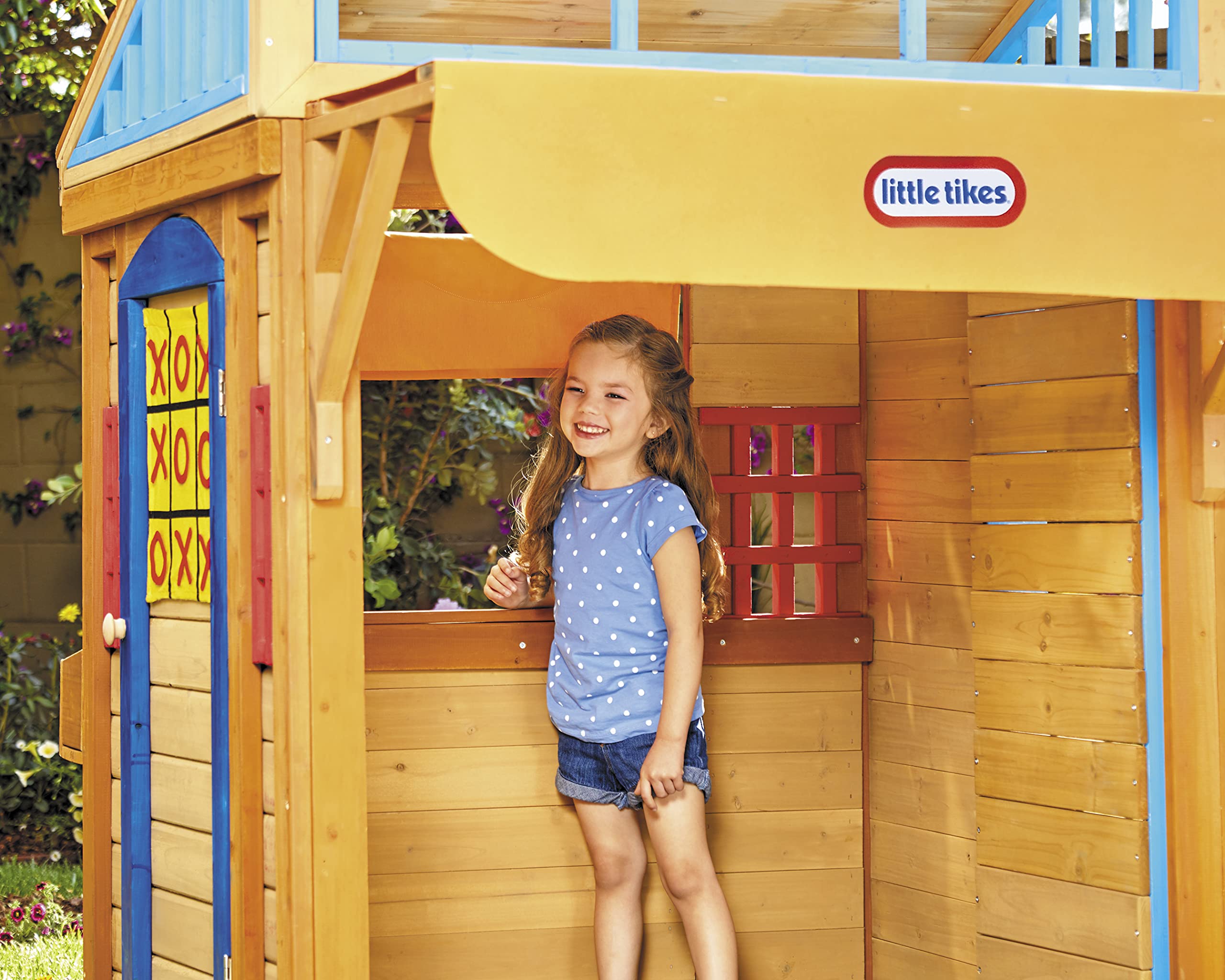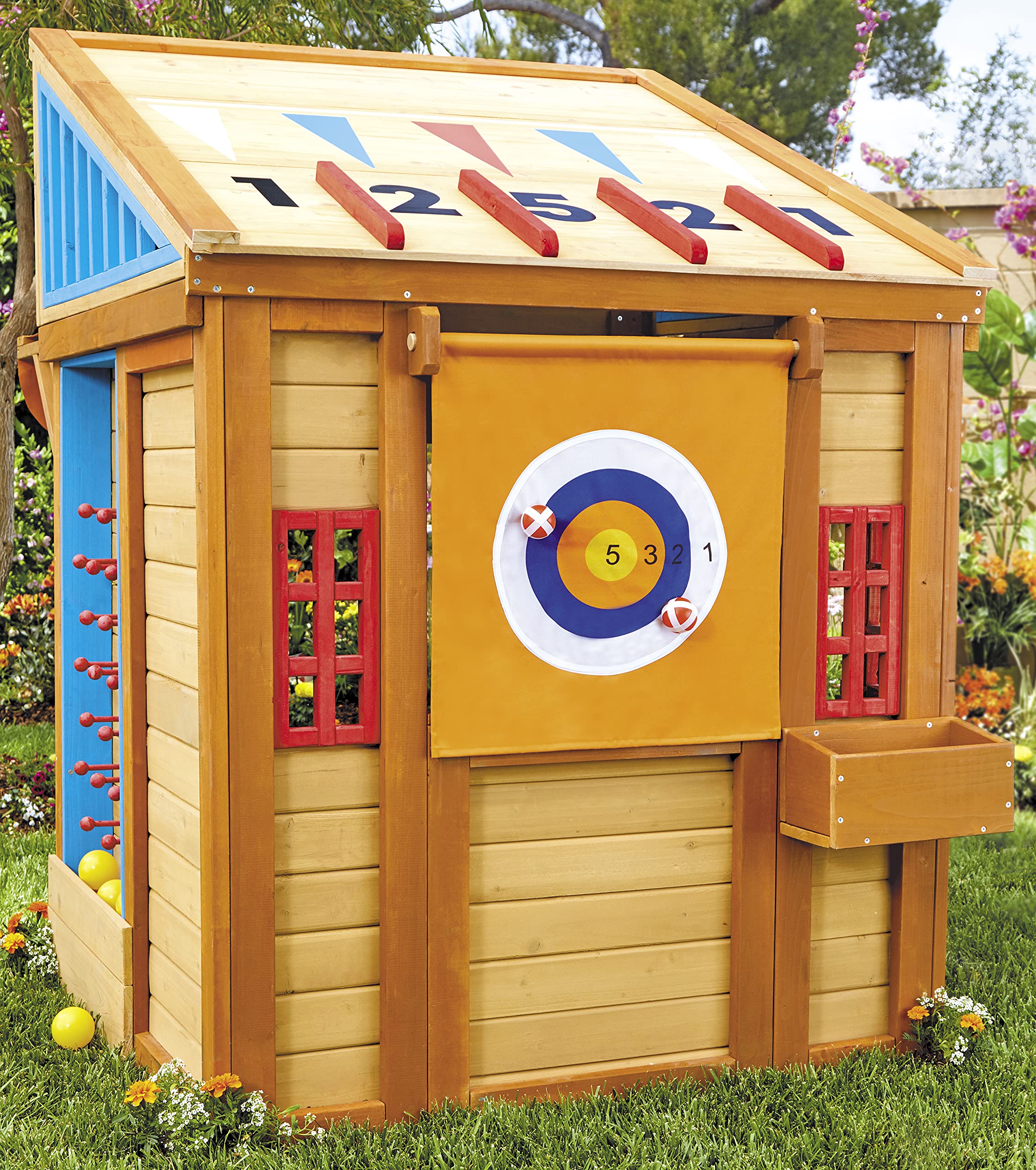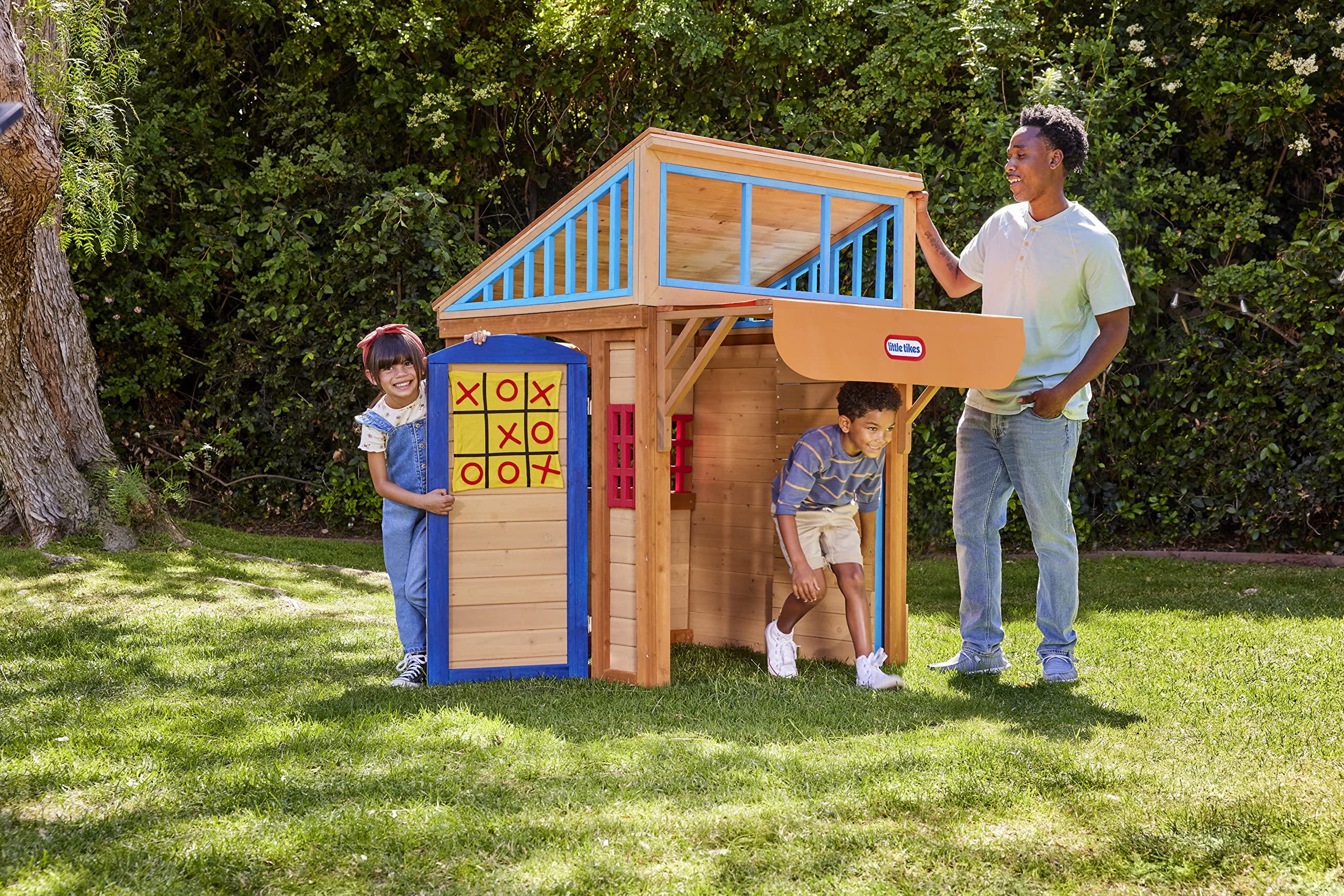 - 5-IN-1 - This sturdy wooden playhouse features different games on every surface!