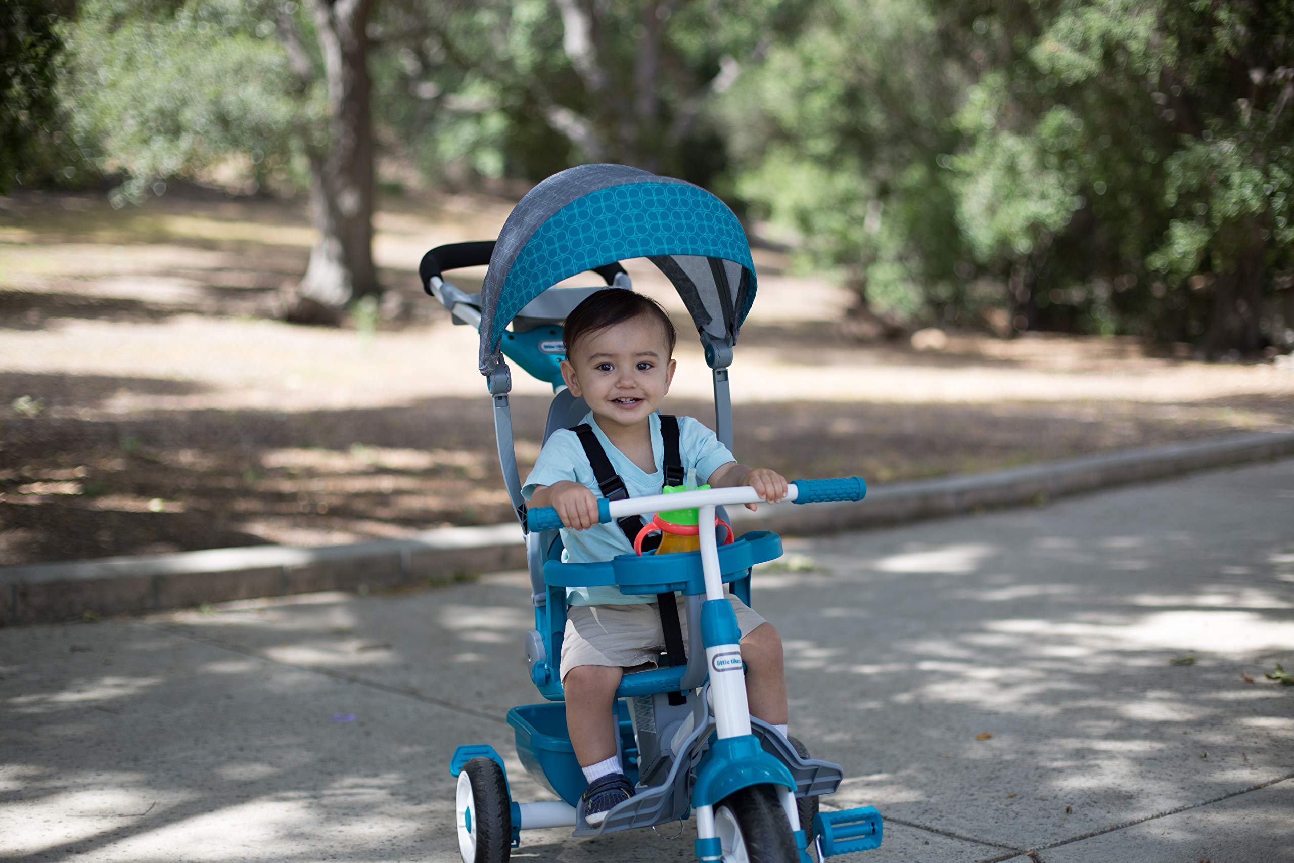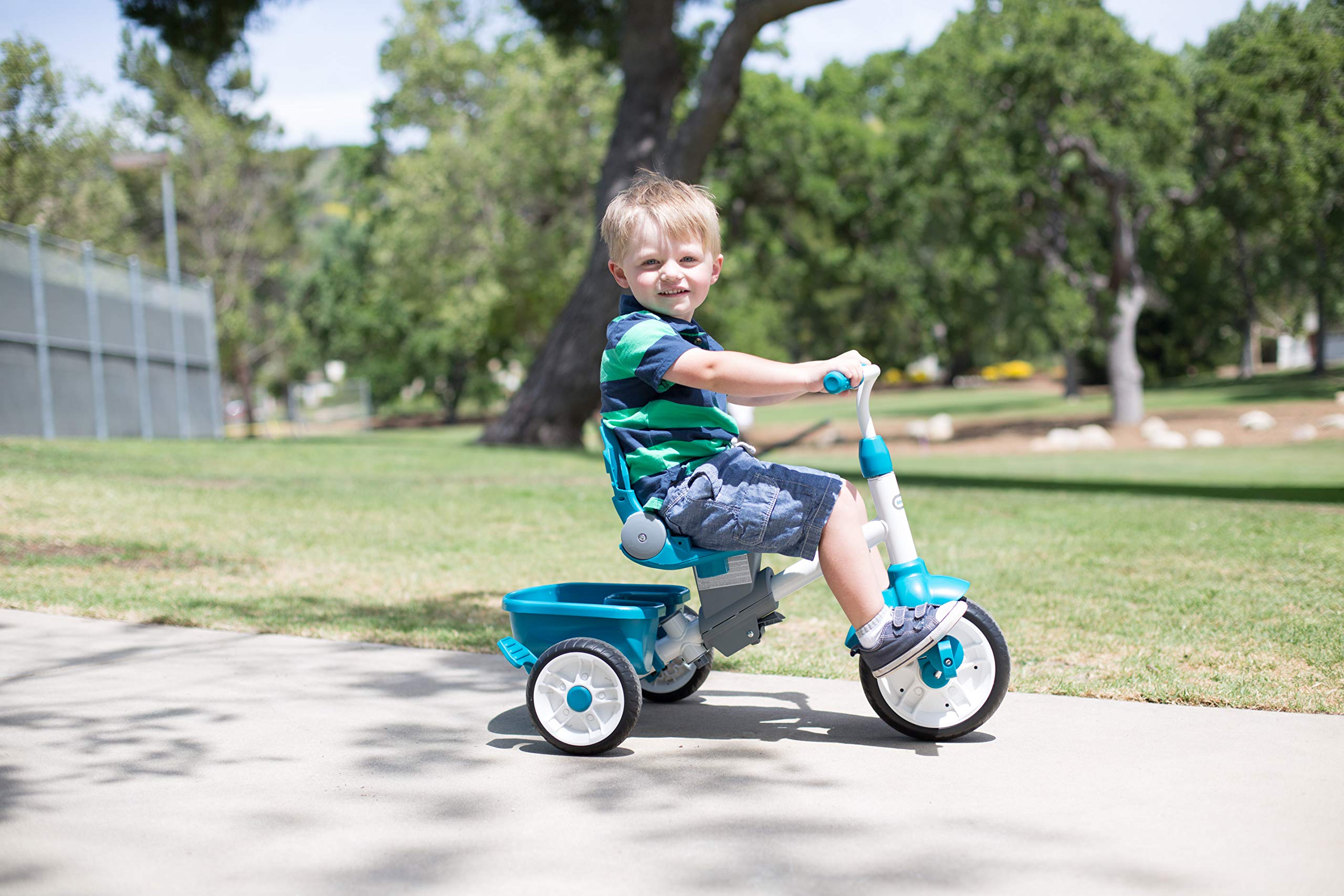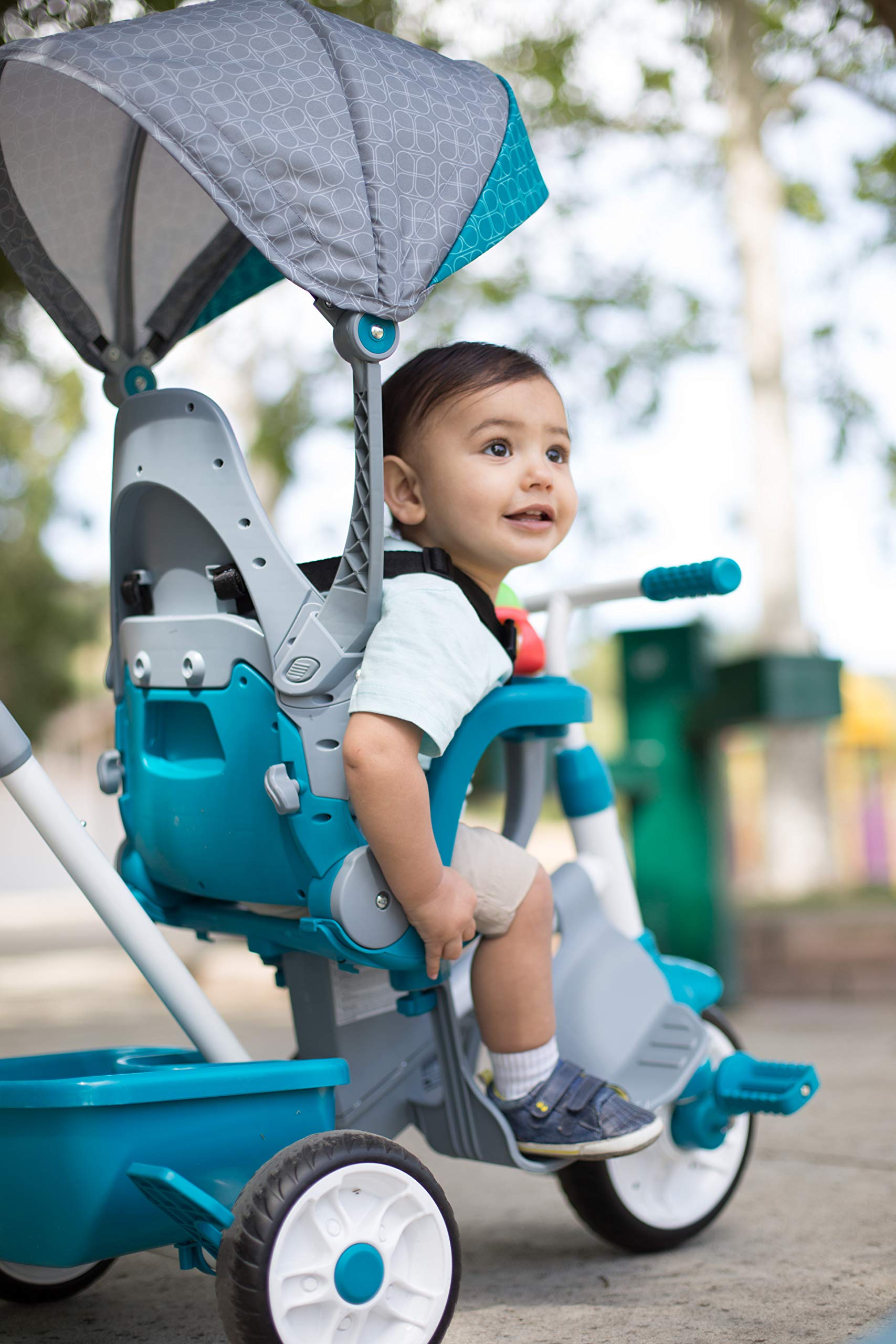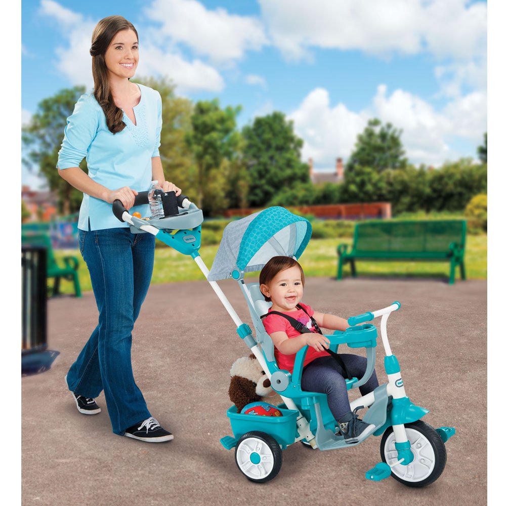 - 4-stage teal toddler trike grows with your child and is perfect for on-the-go travel