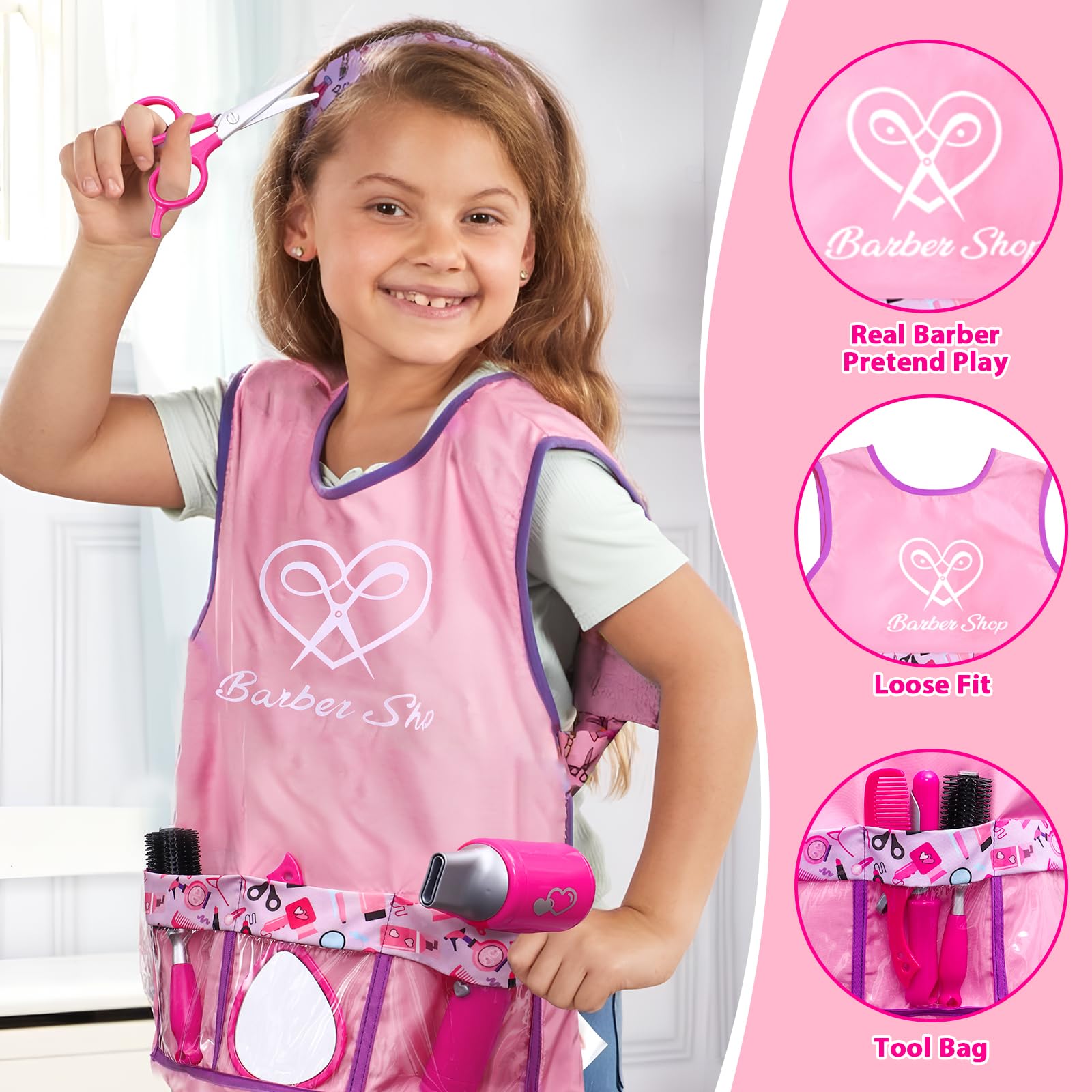 - u3010Super Luxurious 49 Pcs Hair Salon Kits for Girlsu3011---Our girls hair salon toys set includes 43 pcs kids barber set toys, 1*realistic hair dryer with 2*different style hair dryer head, 1*stylist apron, 1*stylist shawl, 1* unicorn folding comb, 1*curling iron, 1* flat iron, 1*round hair brush, 1*comb, 2*hair rollersuff0c1*scissor, 2*headband, 1*vip card ,3*toy perfume, 1*toy lipstick, 2*curly hair, 3*hair spray, 2*unicorn hairpin, 11 hair ties, 11*decorative accessories and an exquisite carrying gift