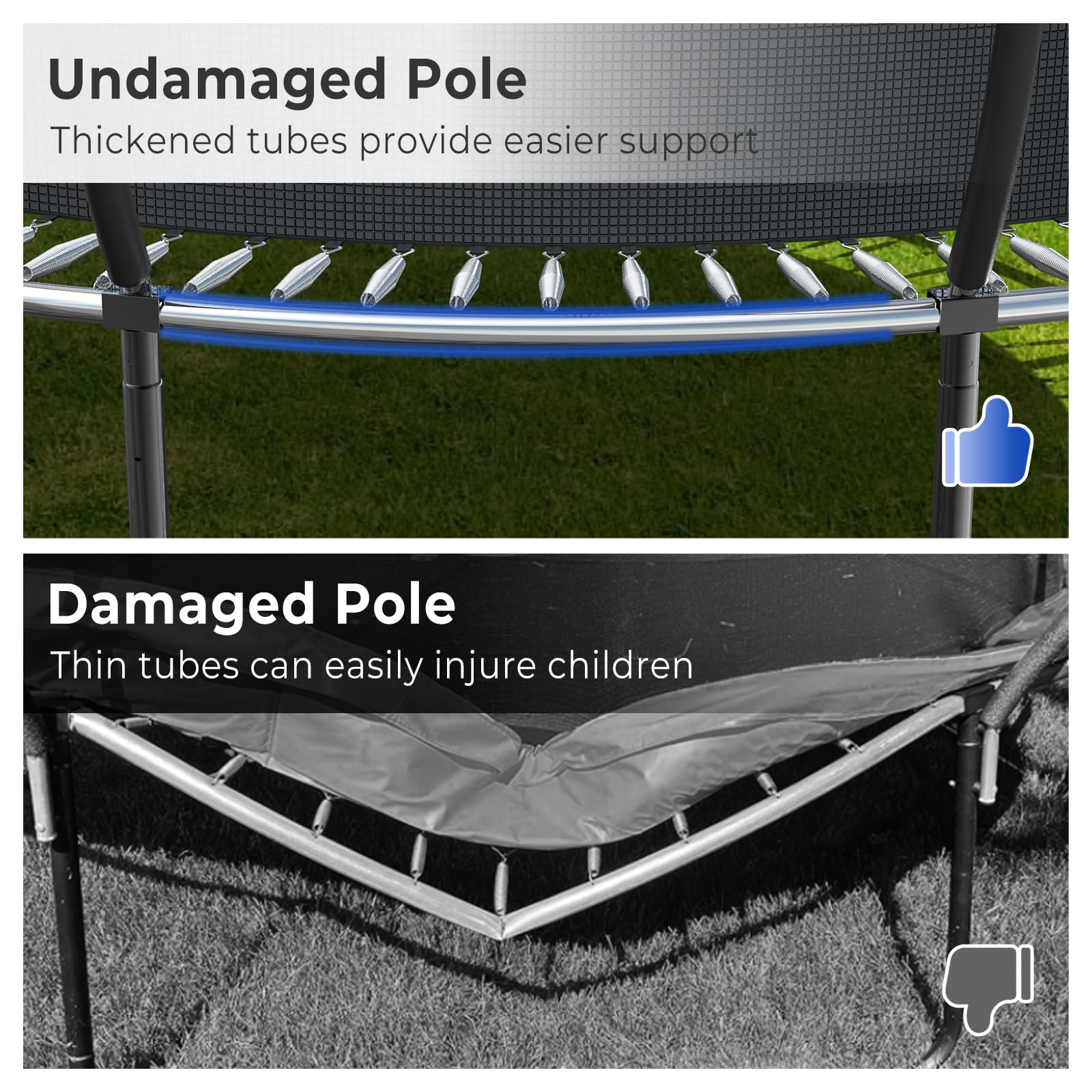 - u3010Once For All Installationu3011This outdoor trampoline is made of galvanized frame inside and outside, legs are powder coated for extra protection against rust. No more need to disassemble the trampoline and bring it home even in the rain and snow day