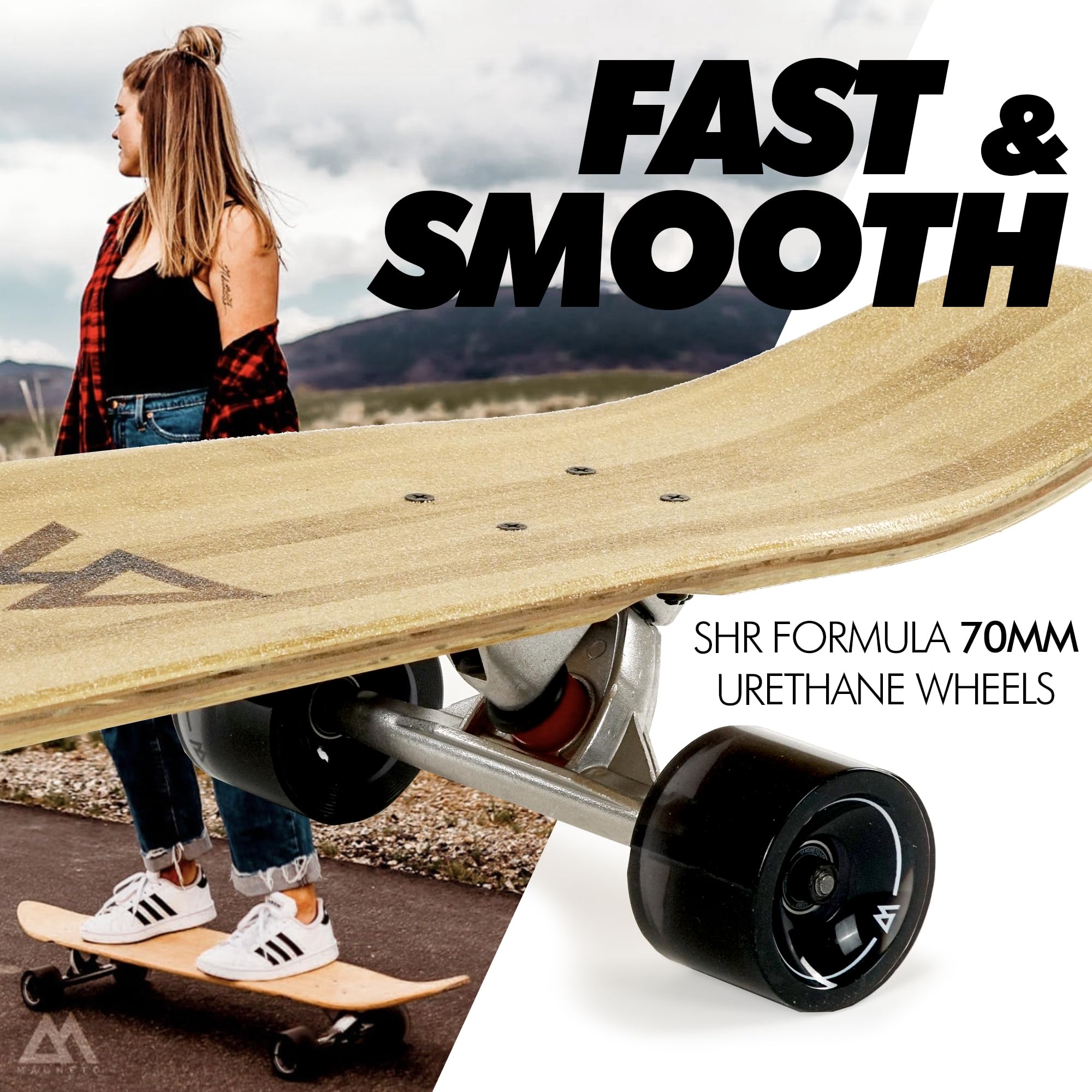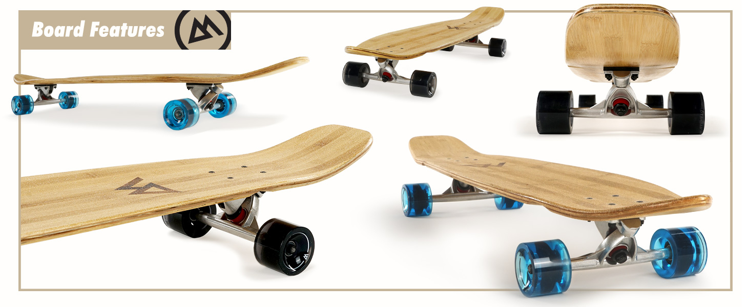- QUALITY MATERIALS - The deck is made with bamboo veneer on top and bottom with a maple core to add strength and stiffness; This makes the deck super durable and beautiful; The sand grit finish provides grip without the hassle of replacing grip tape and shows off the beautiful bamboo design; The trucks are made from gravity cast aluminum which makes them strong and durable; The bushings are SHR (medium stiffness) which adds to the cruising experience