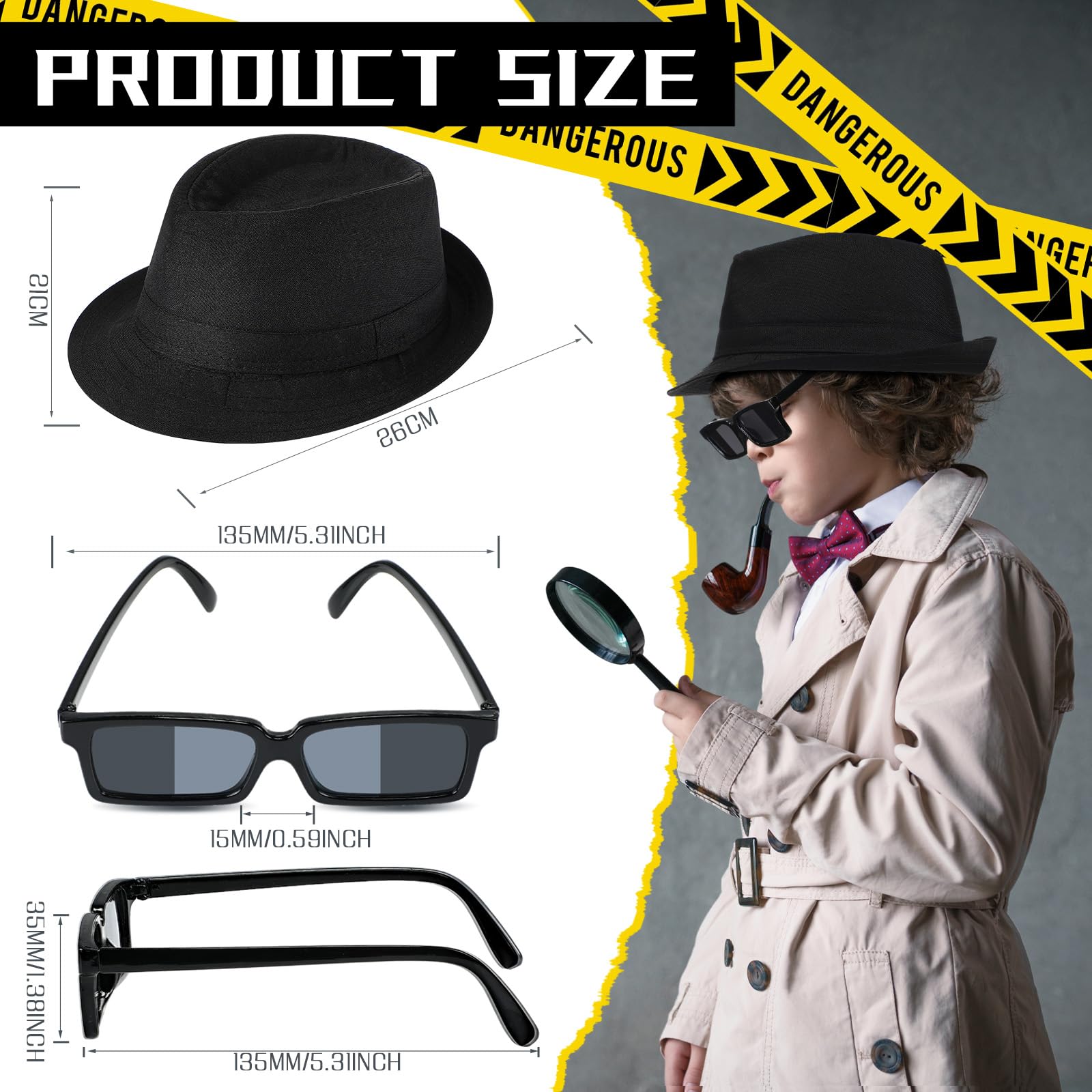 - Suitable Size: the glasses with rear view are about 5.1 inch/ 13 cm long between two lenses, with a leg length of 5.5 inch/ 14 cm; The circumference of detective hat is about 21 inch/ 54 cm, suitable for children aged 5-12 years old