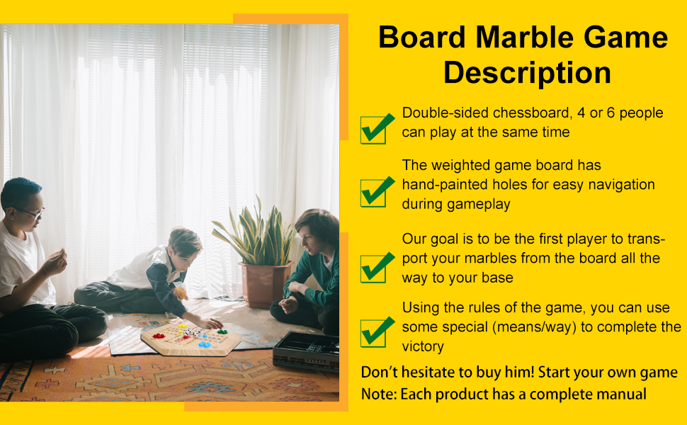 - u3010Classic Weighted Gameu3011Our material is selected from high-quality wood. Marble Board Game is a double-sided painted design, suitable for 4 or 6 players, 24 colored marbles (4 of each 6 colors), 6 dice, velvet drawstring pouch for marbles and dice, complete with detailed instruction manual, 20" x 17.3" x 0.8", easy to carry