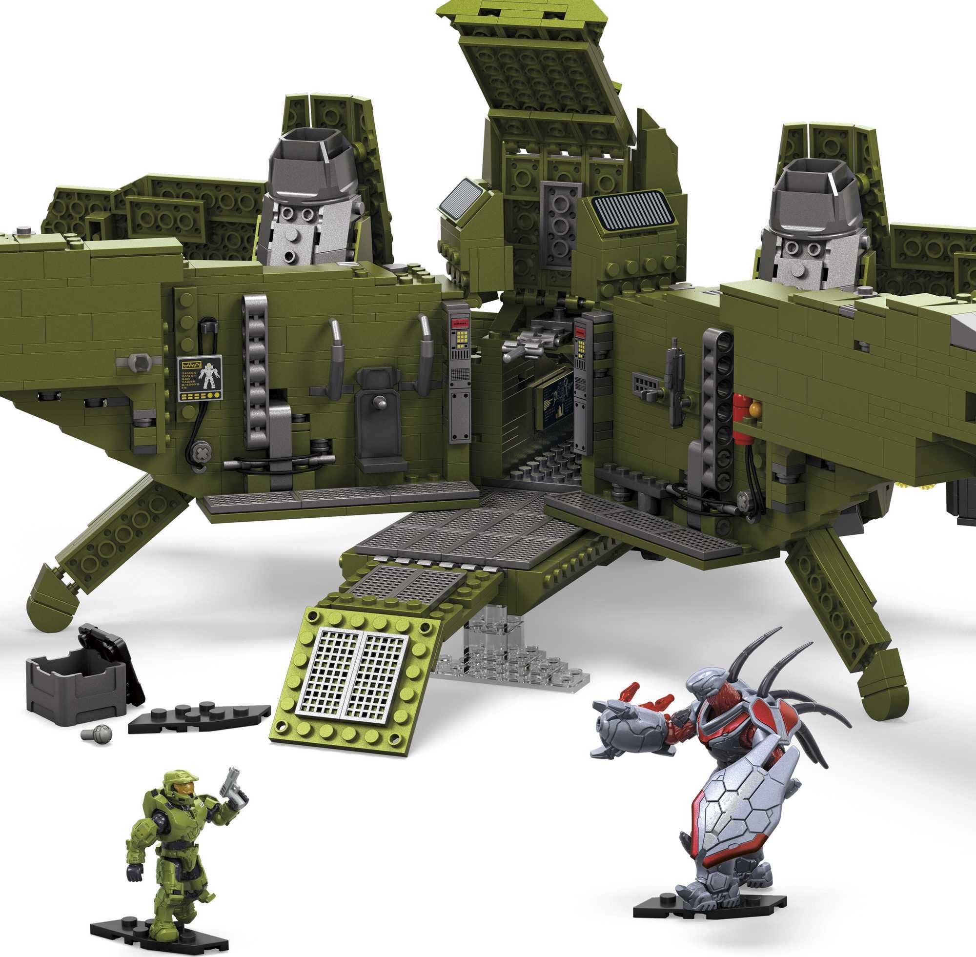 - Large Halo Infinite inspired UNSC Pelican aircraft building set with poseable wings, cockpit hatch, working landing gear, and a secret opening that reveals a hidden interior
