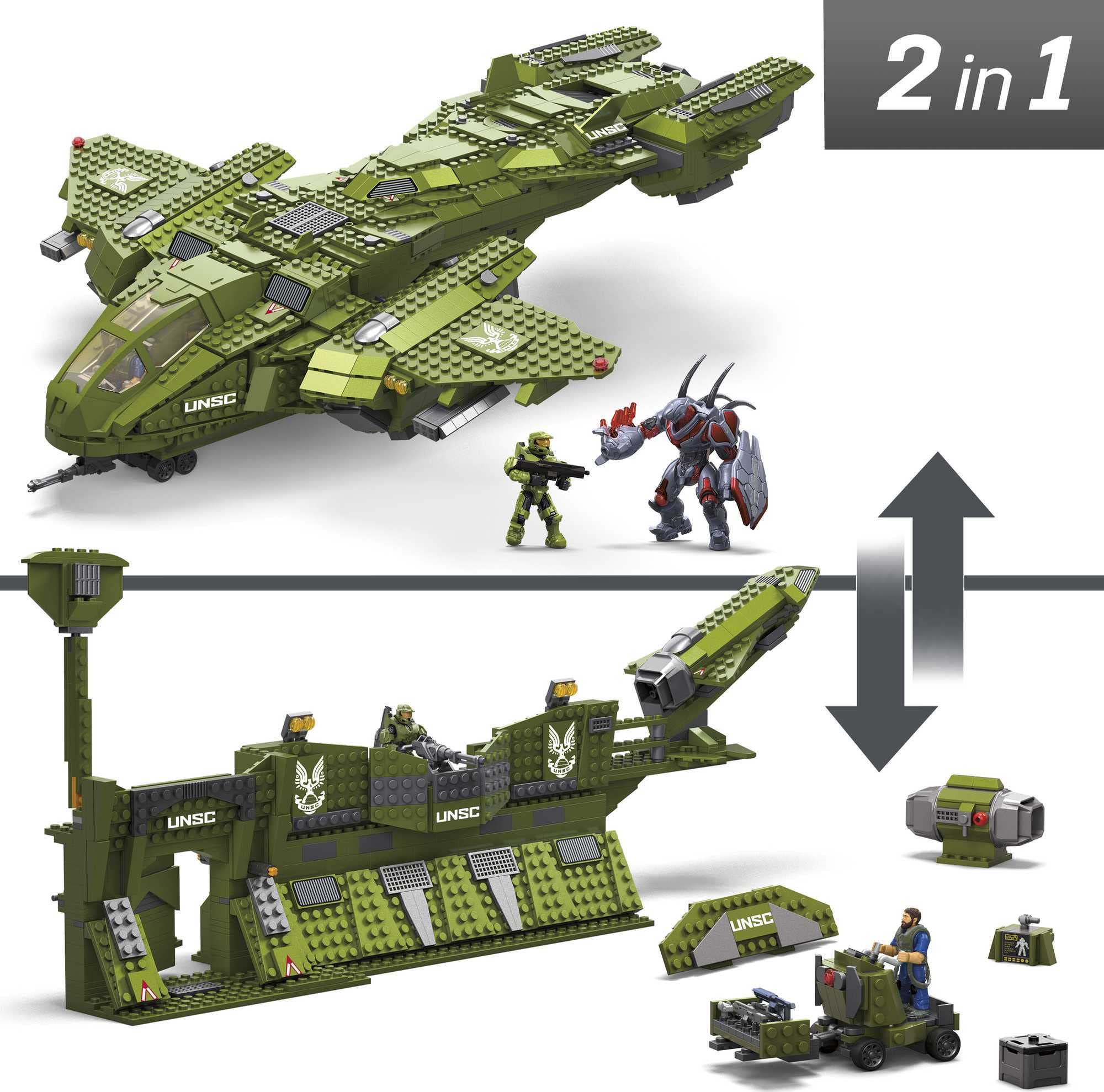 - 2-in-1 building toy: Choose to build the Pelican or a UNSC compound with fortification barrier, forklift vehicle, space rocket, and more