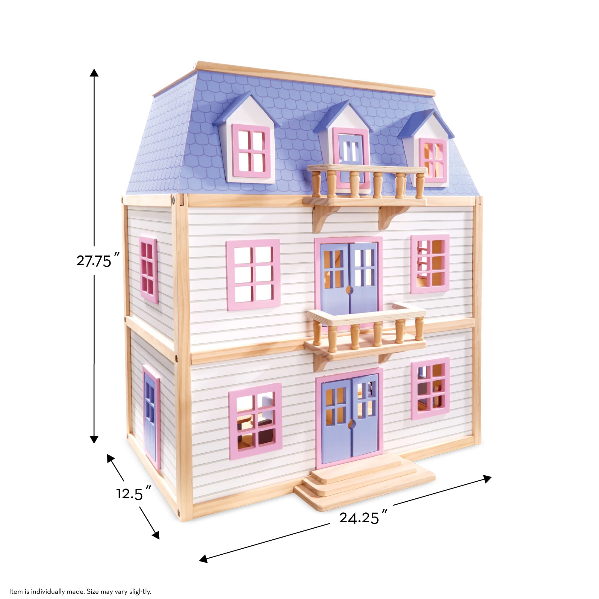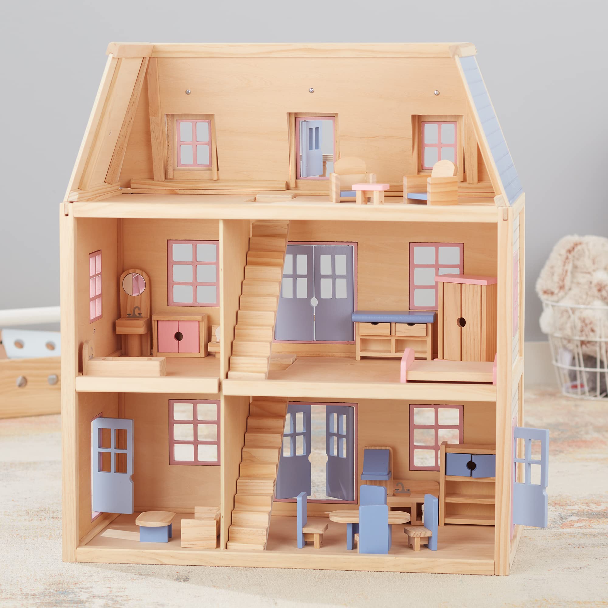- Sturdy, spacious, and versatile wooden three-level, five room dollhouse with 19 pieces of wooden doll furniture, perfect for growing kids