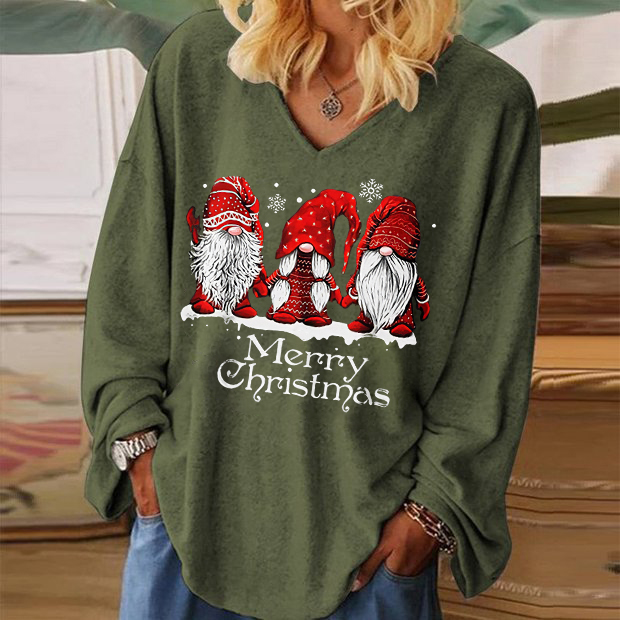 • Merry Christmas Dwarfs Print V-neck Long Sleeve T-shirt
