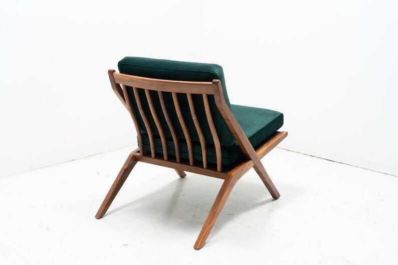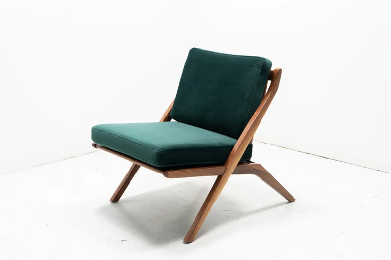 Our Folke Ohlsson inspired scissor chair is an iconic mid century silhouette. The chair is made of walnut that is finished with a natural oil and custom made to order in your choice of fabrics.