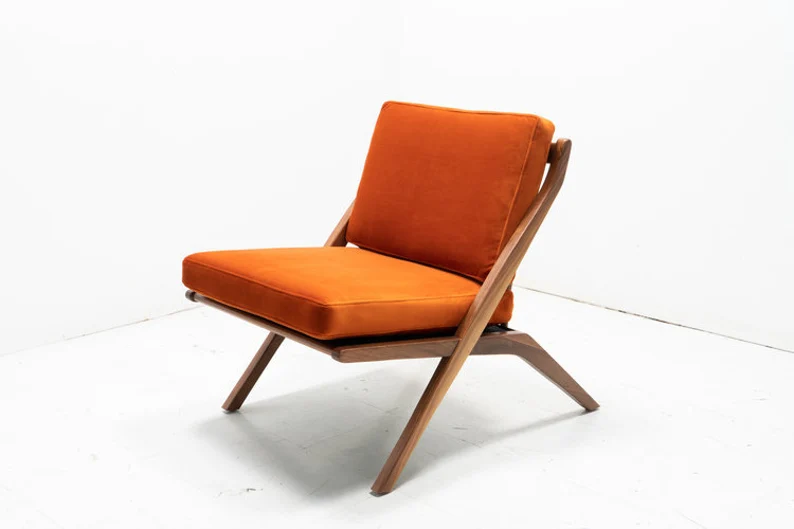 Our Folke Ohlsson inspired scissor chair is an iconic mid century silhouette. The chair is made of walnut that is finished with a natural oil and custom made to order in your choice of fabrics.