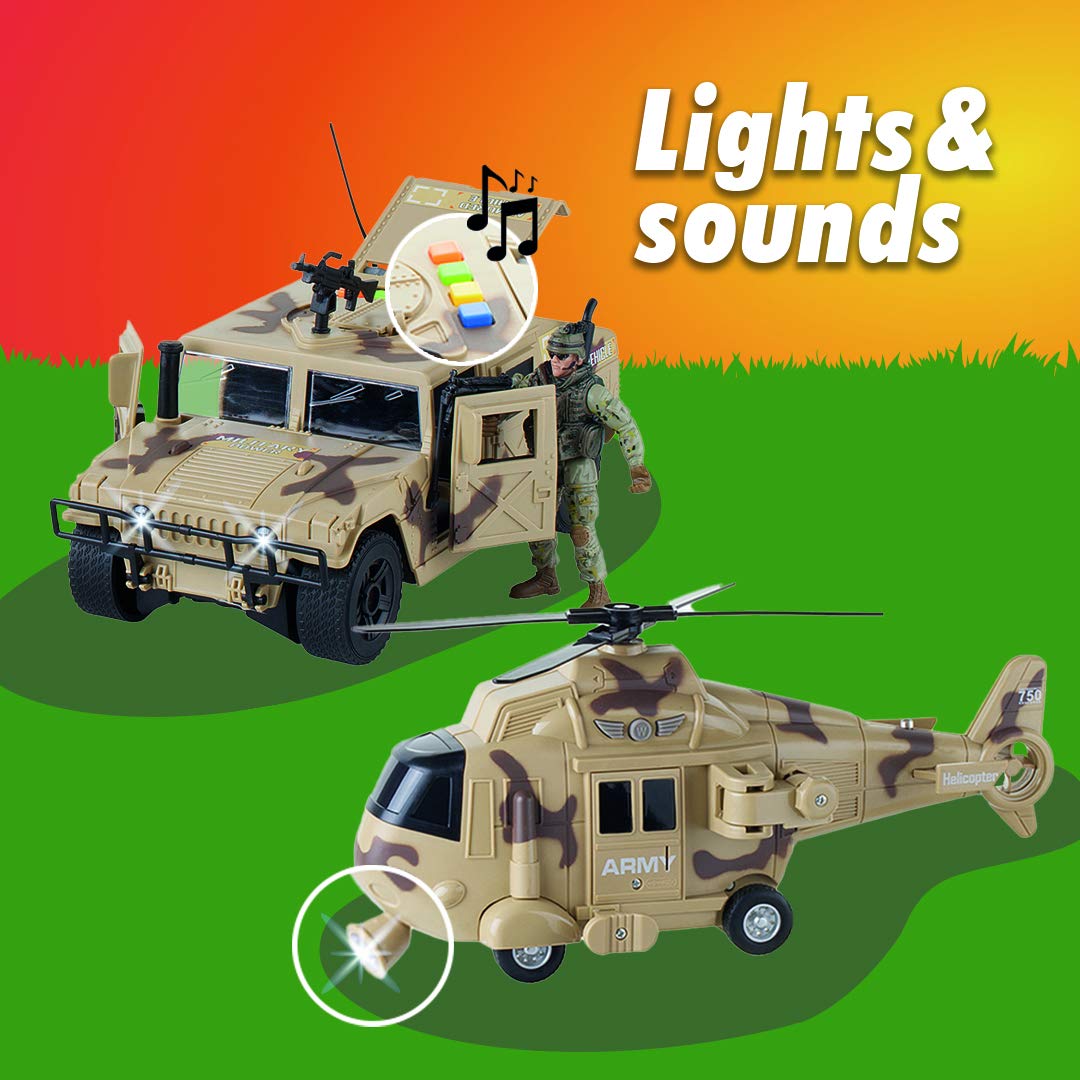 - Immersive Play: This all-inclusive army play set, featuring a military truck, an ATV quadrobike, a chopper helicopter with rescue capabilities, and 2 army soldier figures armed with guns.