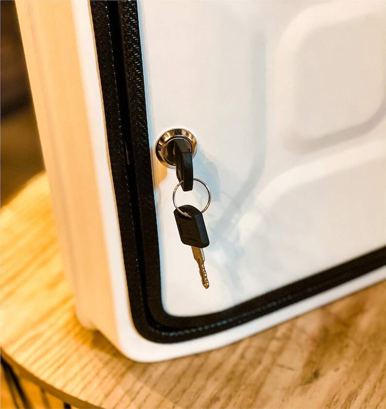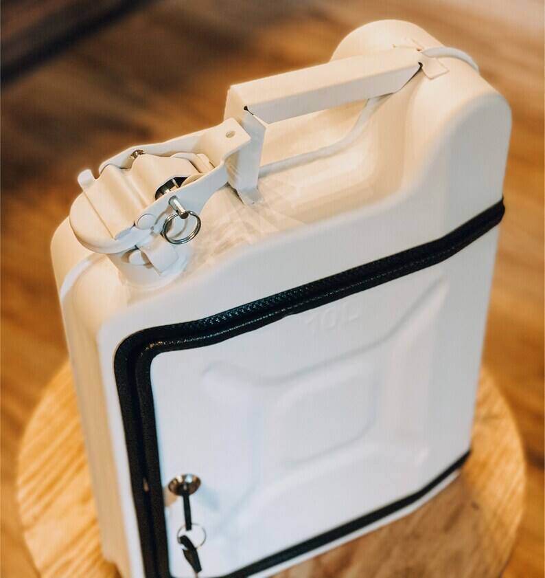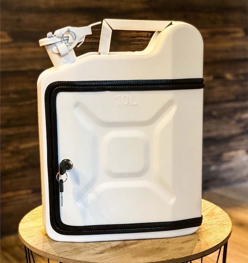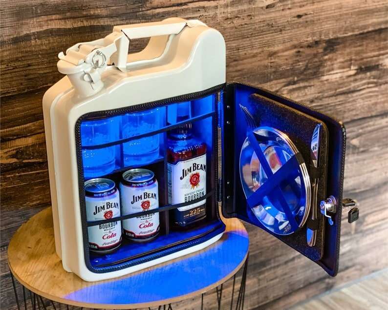 At first glance it looks like a real 10 liter fuel tank, but inside you will find a real surprise. Mini bar that holds a 0.7L bottle, 2 glasses, 2 Pepsi, 2 plates, 2 knives and 2 forks.